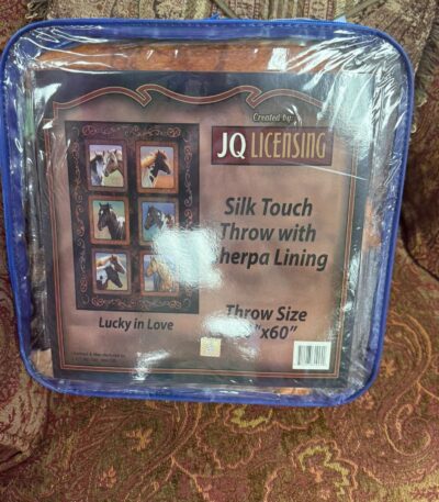 JQ LICENSING “LUCKY IN LOVE” HORSE THEME BLANKET – SHERPA LINED