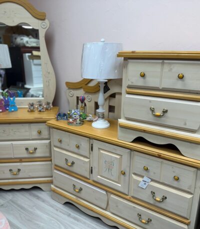 USED – KATHY IRELAND PRINCESS BOUQUET 6 PIECE BEDROOM SET – CHEST DRESSER, DRESSER, MIRROR, NIGHTSTAND, TWIN HEADBOARD, FULL HEADBOARD