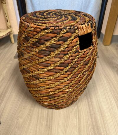 RATTAN WICKER MULTI-COLOR ROUND TABLE WITH HANDLES – 13″ DIAMETER AT TOP – 16″W AROUND MIDDLE AND 18″ H