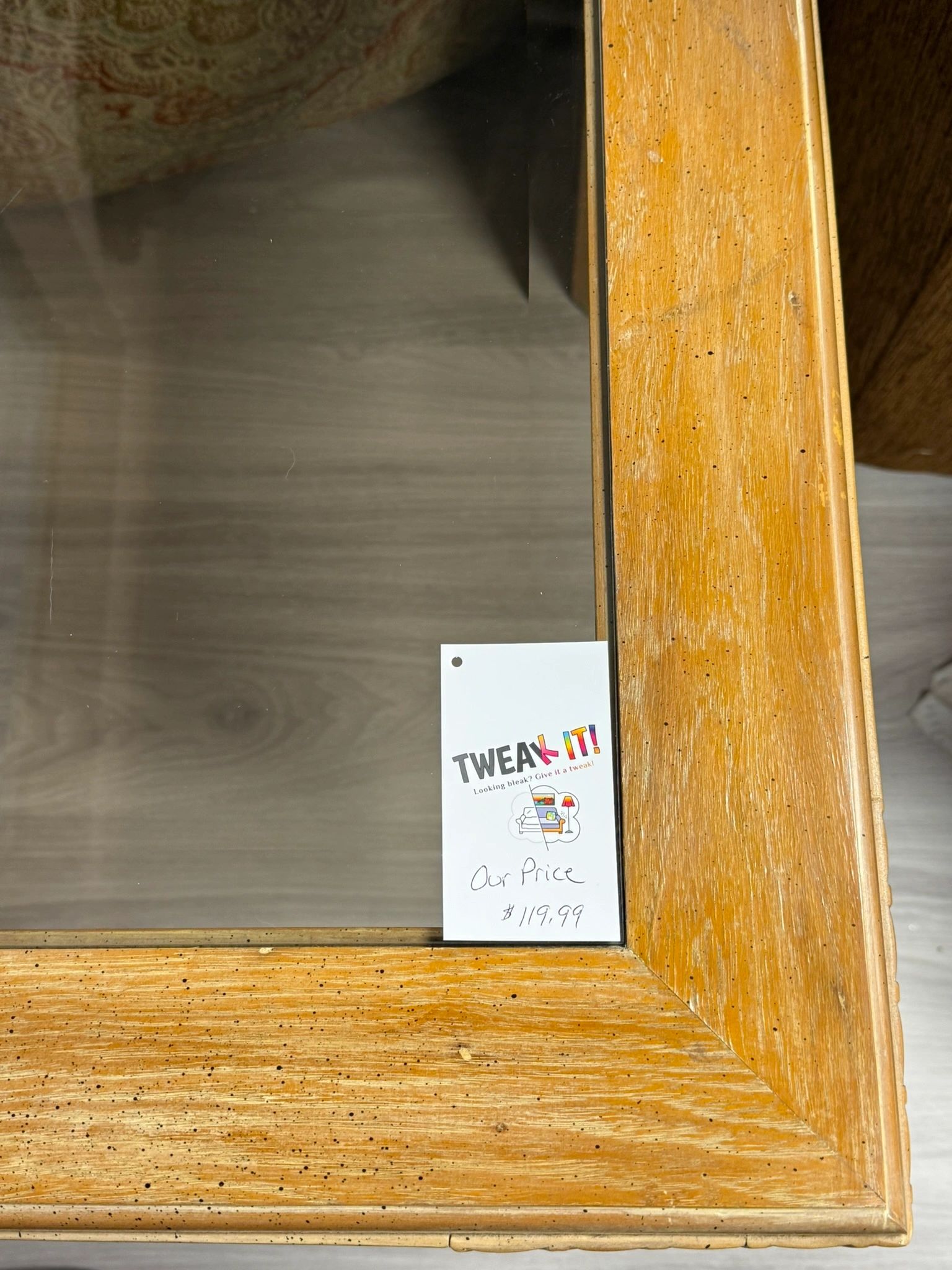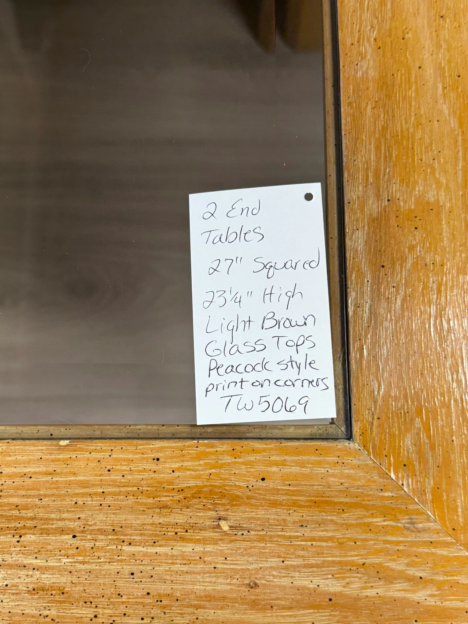 Add a touch of elegance to your living space with these light brown wood end tables featuring peacock style print on corners and glass tops. Perfect for any home decor.