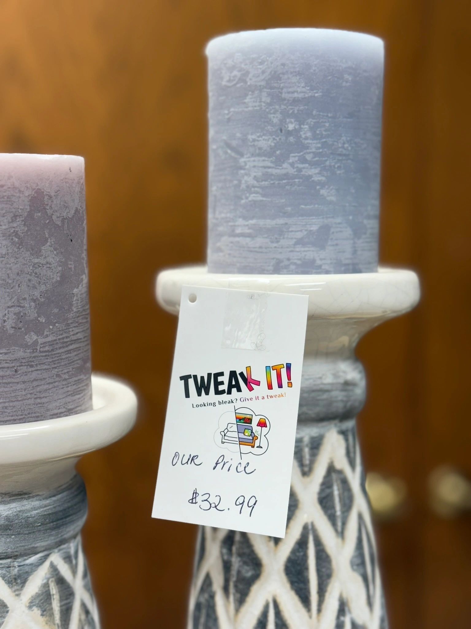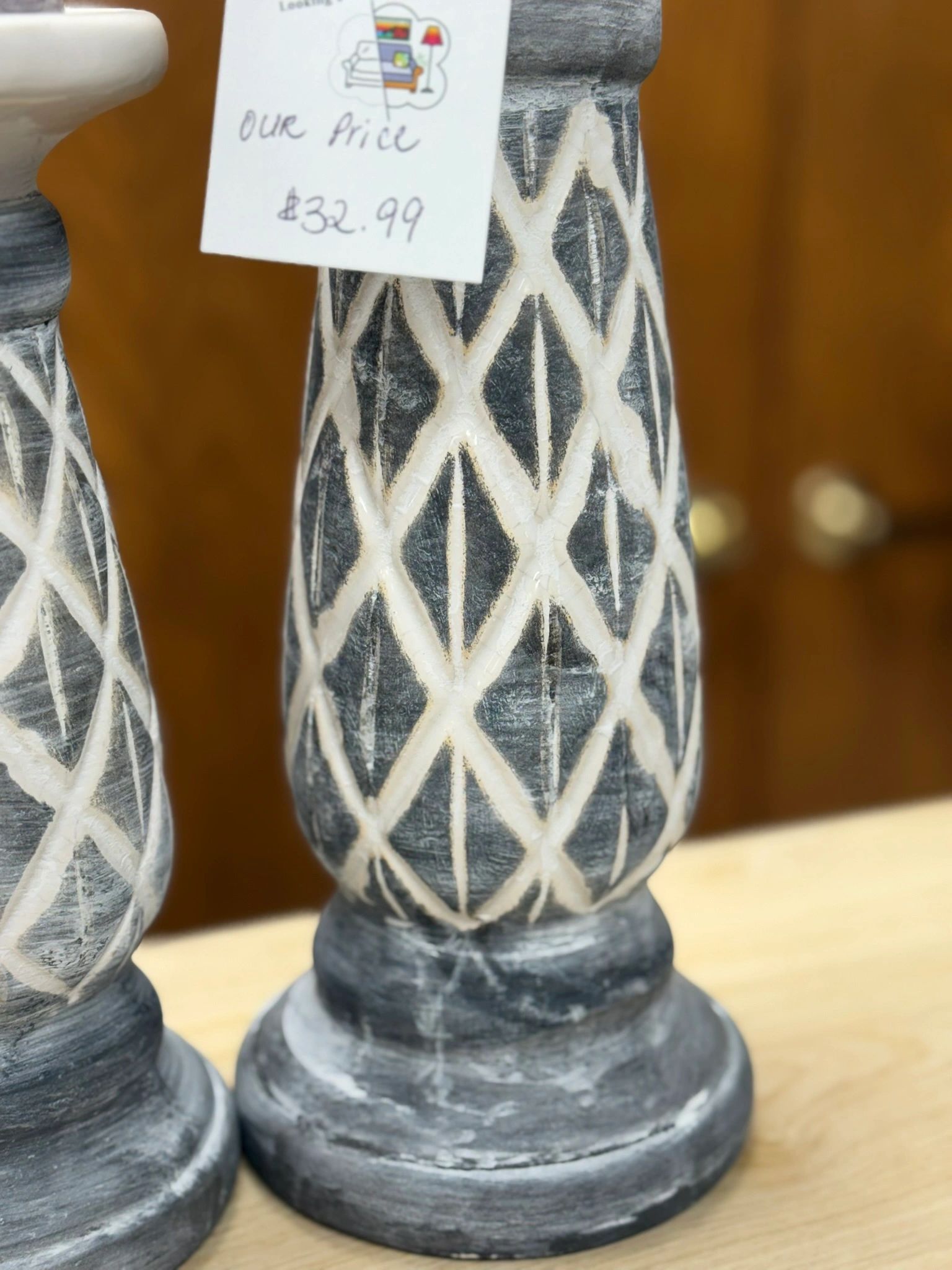 Elevate your home decor with this elegant 2-piece set of used ceramic candle holders featuring a stunning diamond pattern in shades of grey and white. A sophisticated addition to any space. **Candles not included.