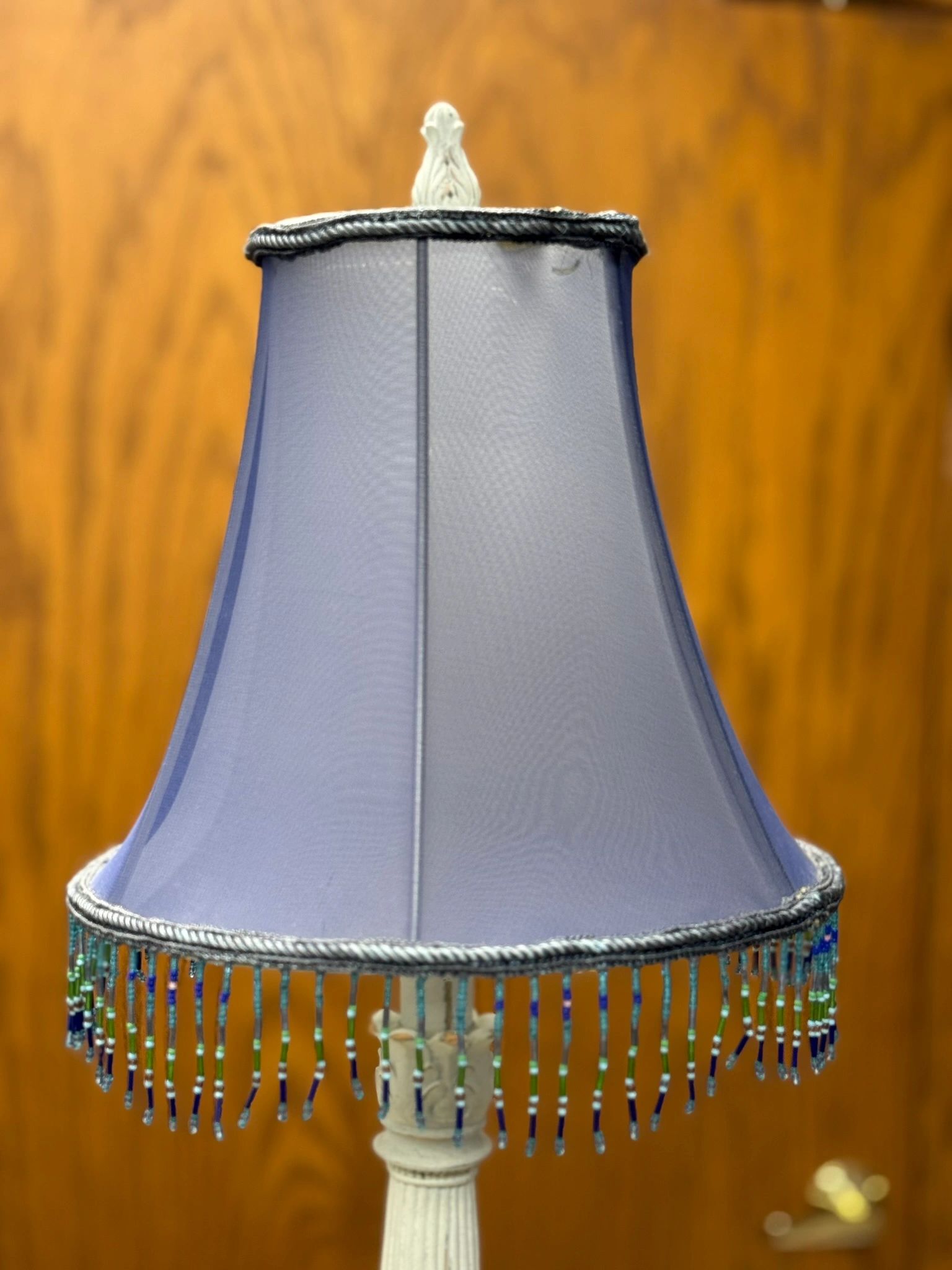 25.5″H BEAUTIFUL CUSTOM VICTORIAN DISTRESSED GREY TABLE LAMP WITH PURPLE BEADED SHADE