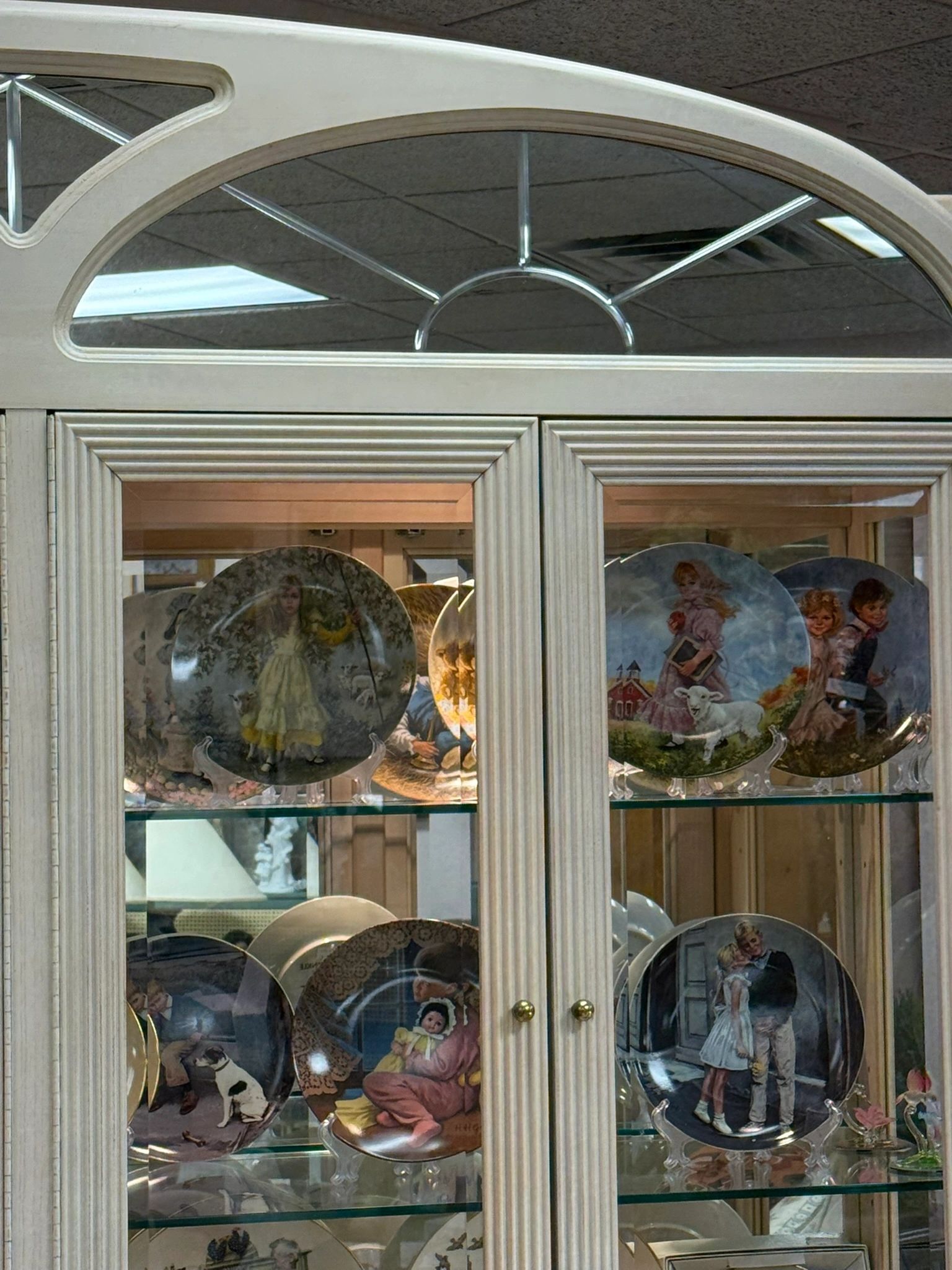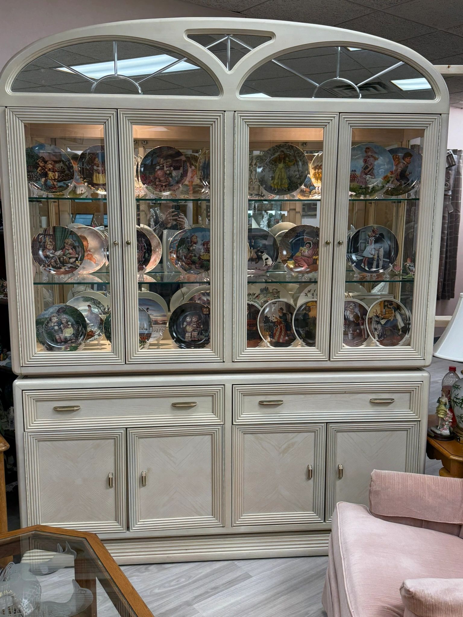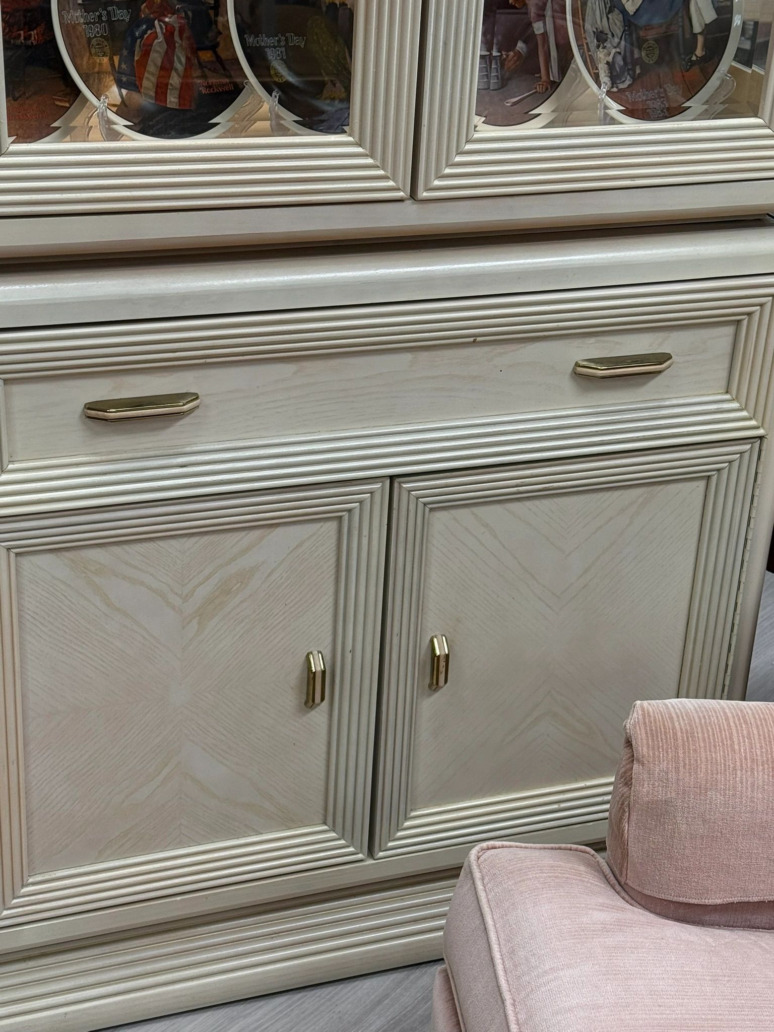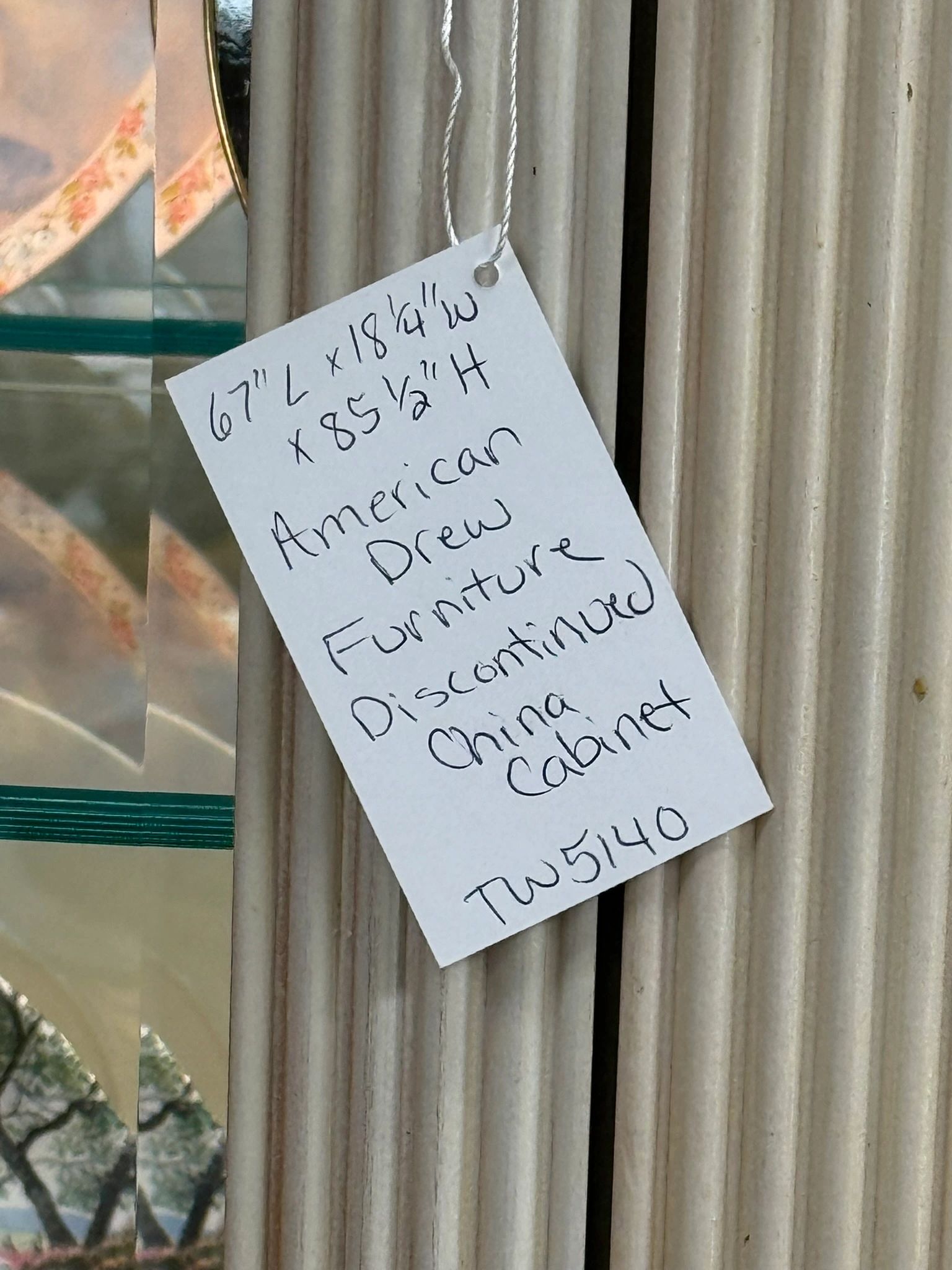 Add a touch of elegance to your home with this Antique American Drew Furniture China Cabinet/Curio. Featuring 2 drawers, 2 cabinets, 3 shelves, and 2 lights, this beautiful piece is sure to impress. Item is used and shipping is not available.