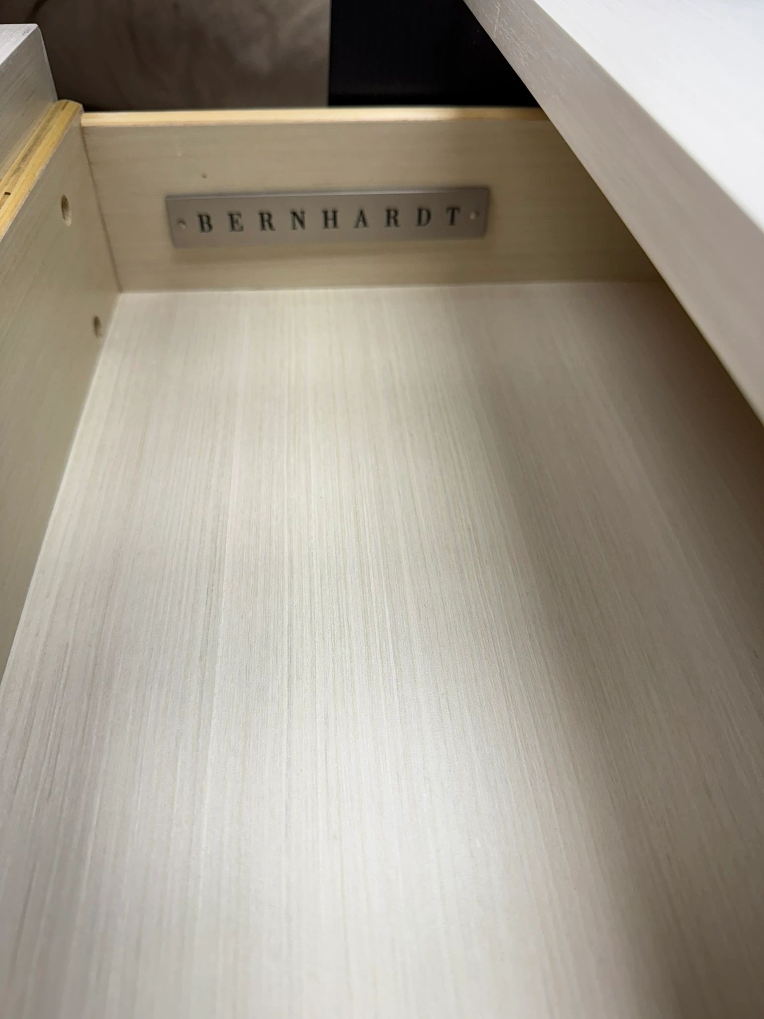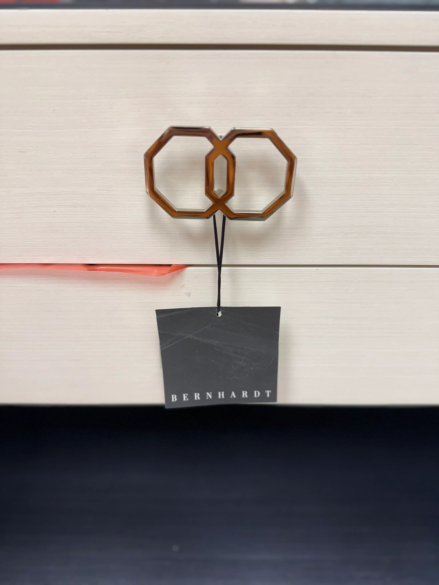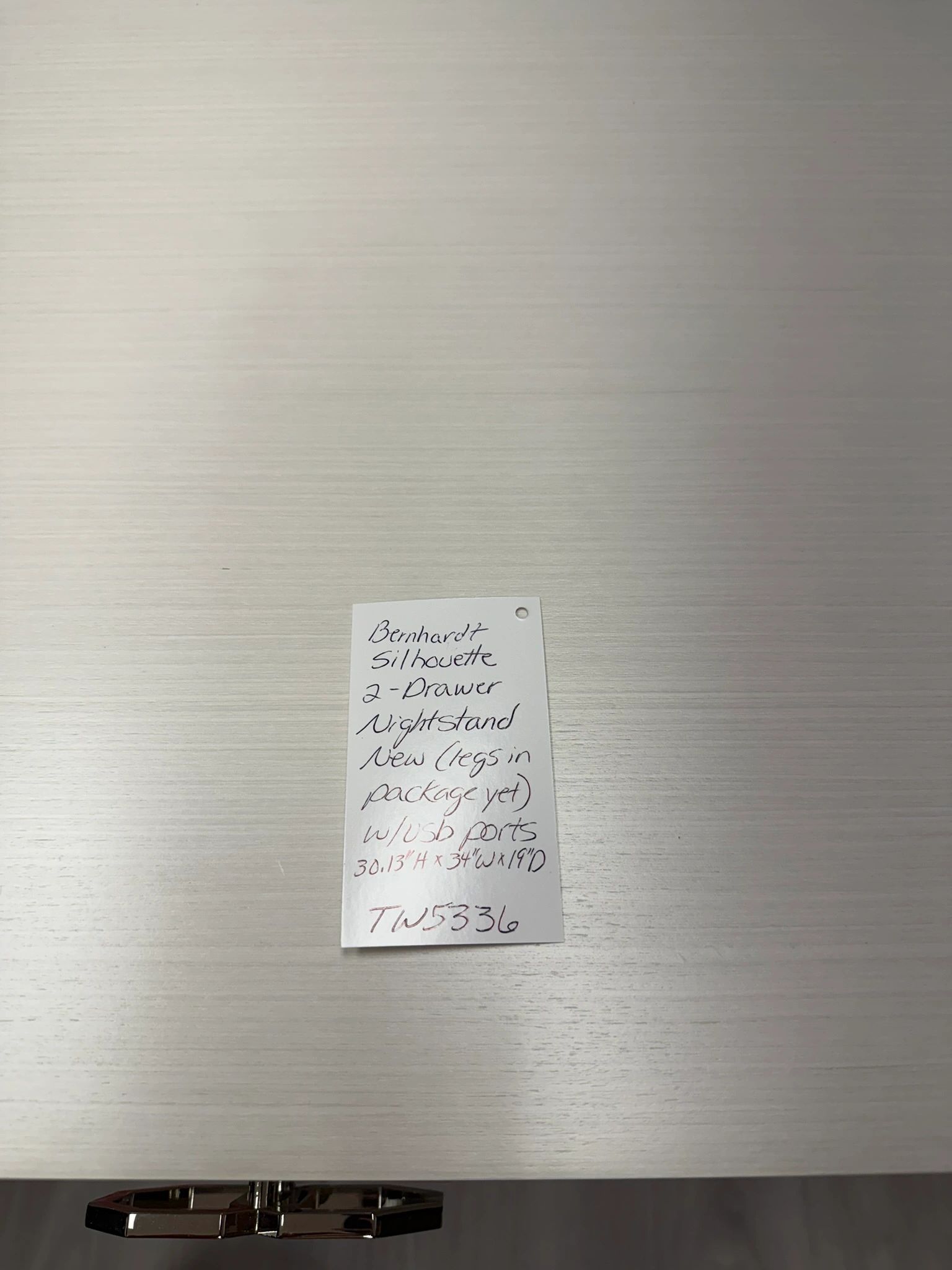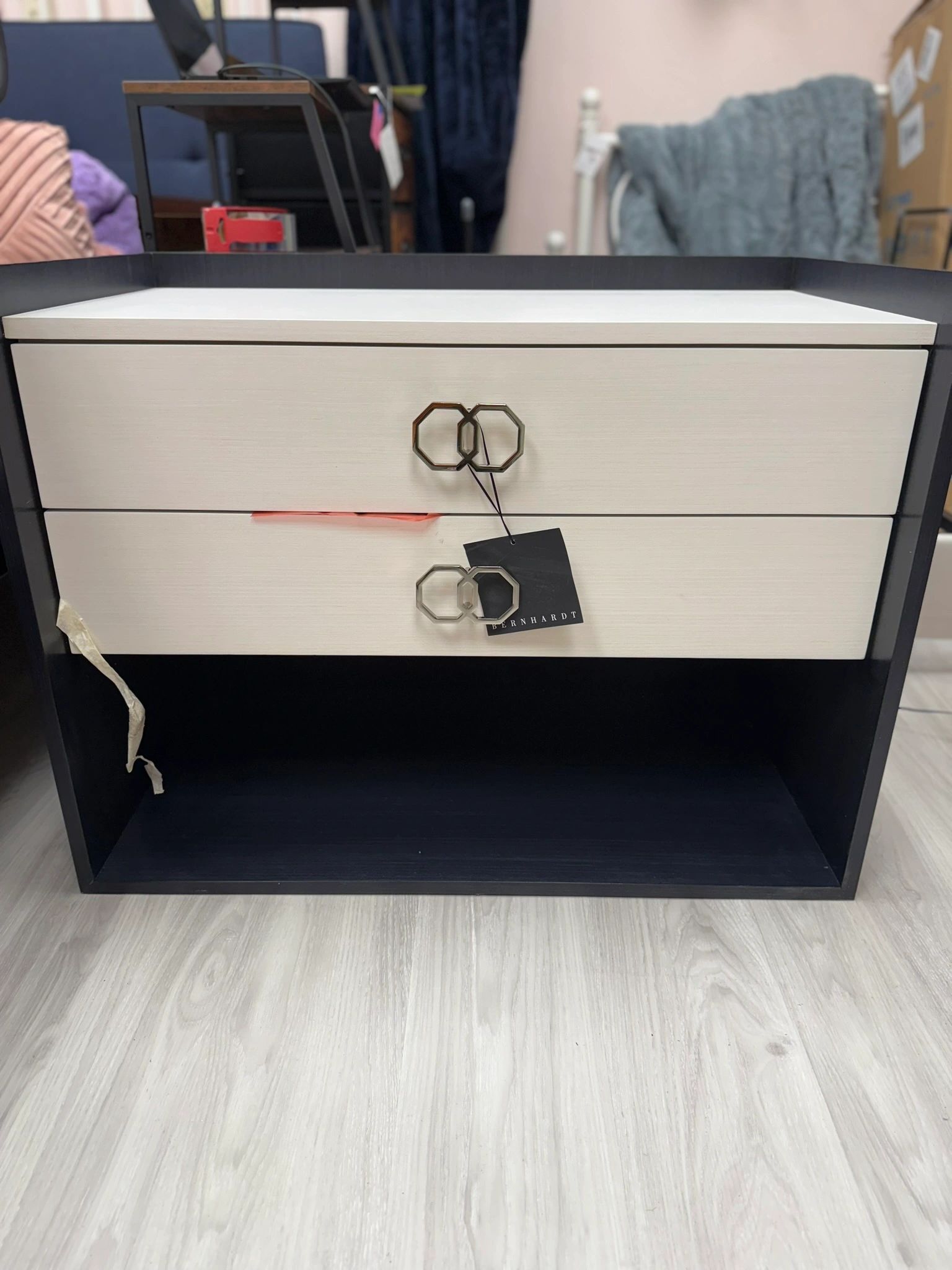 The Bernhardt Silhouette 2-Drawer Nightstand adds a touch of modern elegance to your bedroom decor. Featuring unique geometric handles and a sleek black frame and 2 usb ports. Shipping not available.