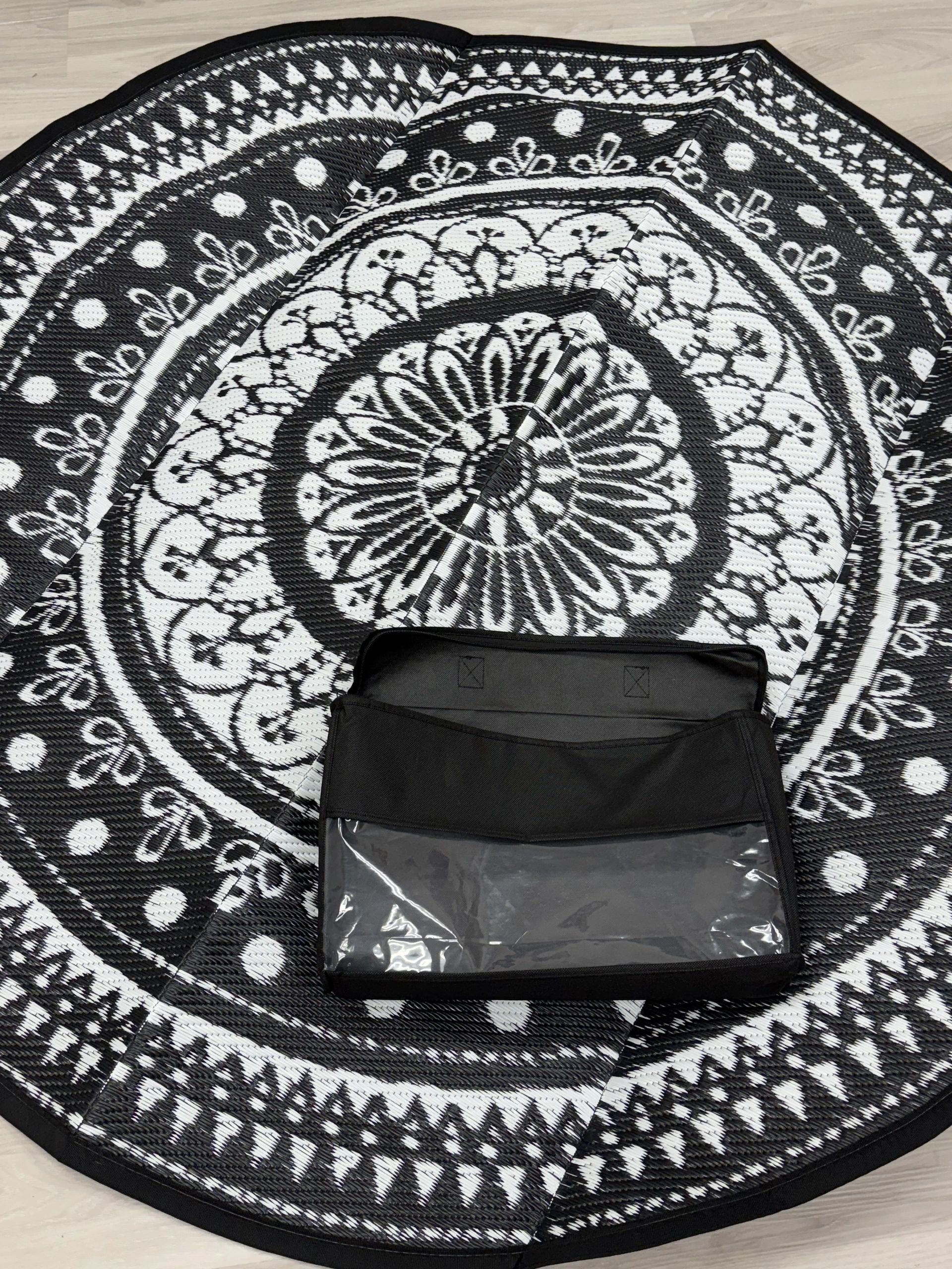 Cekene Round Outdoor Rugs Waterproof 5Ft Reversible Outdoor Patio Rugs Lightweight Plastic Straw Rugs Portable RV Camping Mat Floor Carpet for Deck Porch Picnic, Black and White
