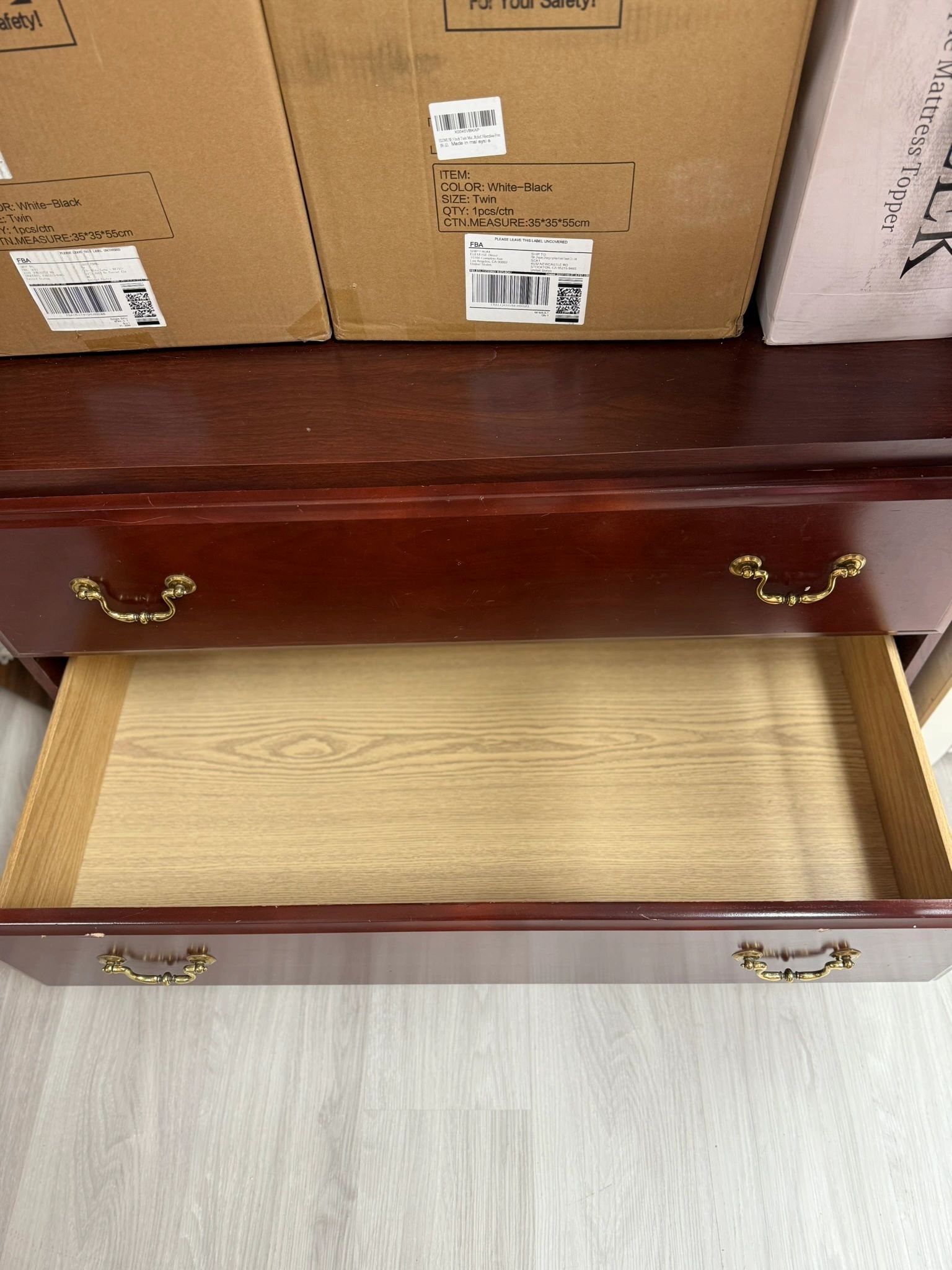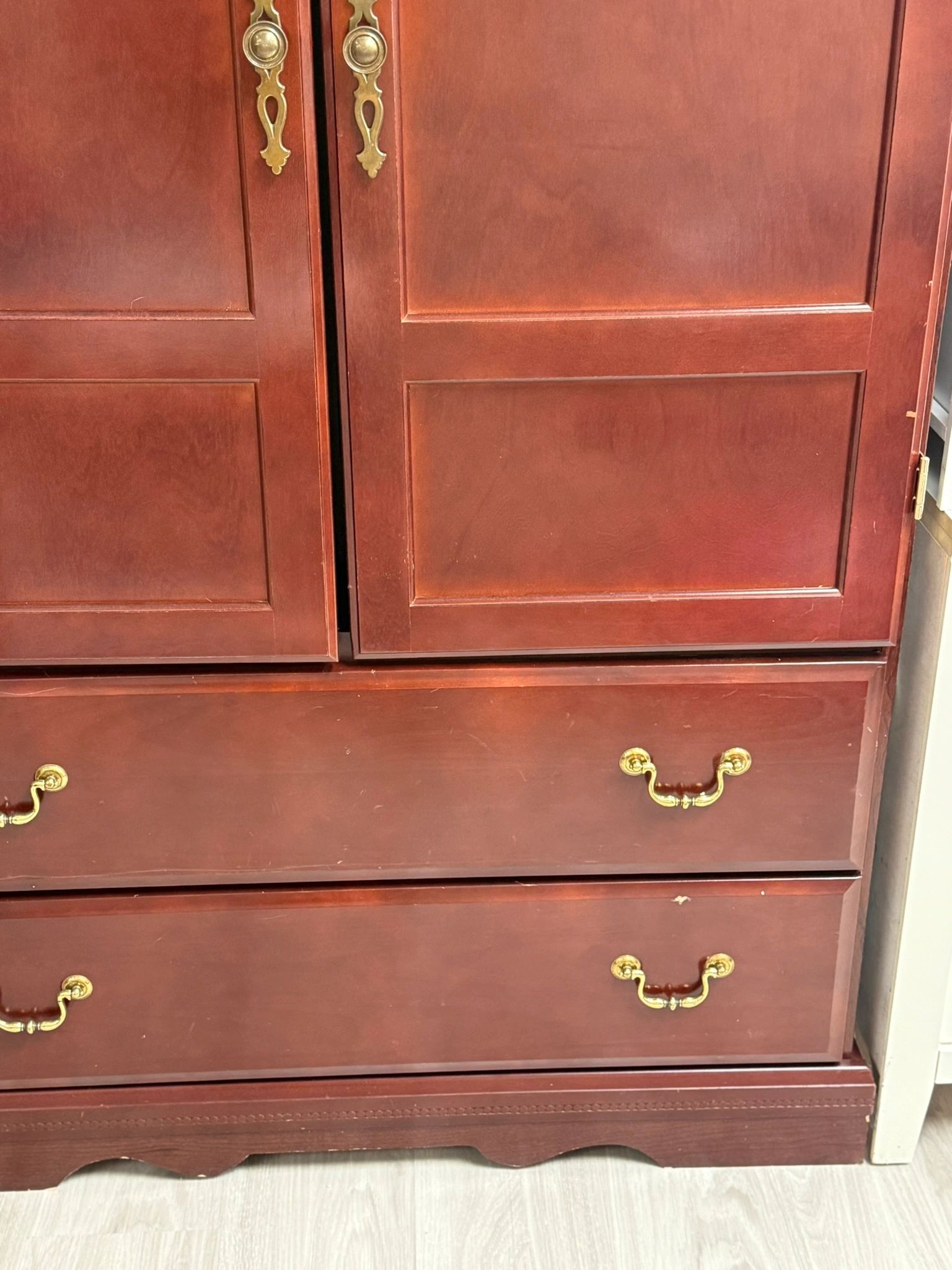 This used cherry wood armoire is a timeless addition to any personal home. Featuring two paneled doors and two drawers with brass handles, this piece exudes elegance and functionality. Pictures show a few blemishes/scuffs.