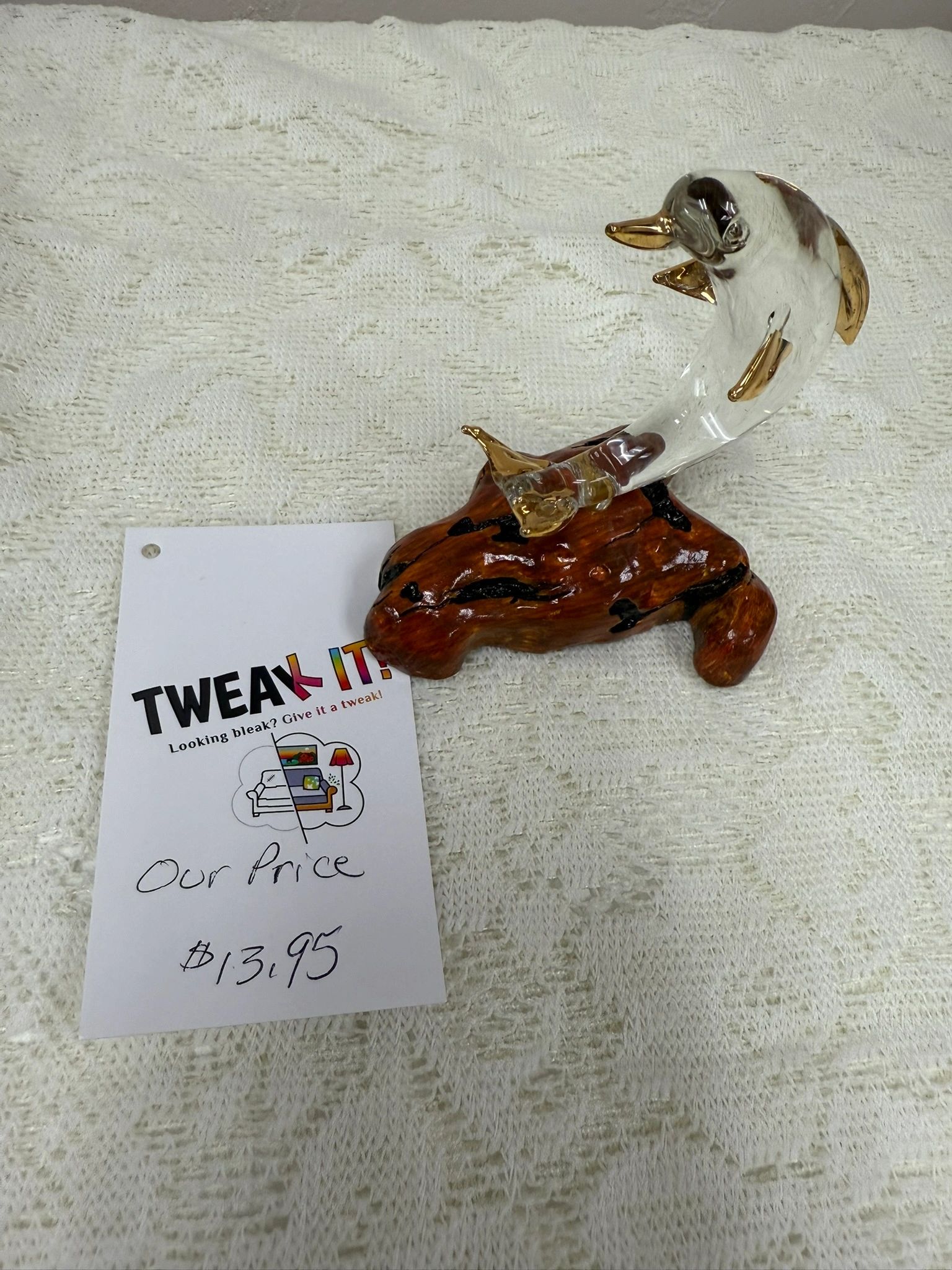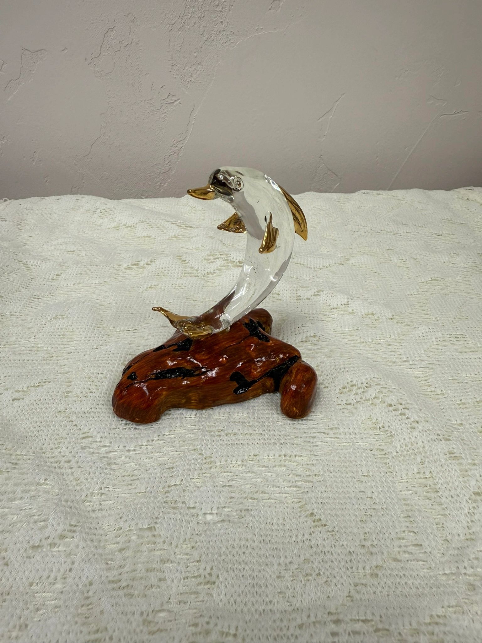 Elevate your home decor with the elegant Dolphin Glass Gold figurine. Crafted with a clear glass body and gold accents, this piece adds a touch of sophistication to any space.