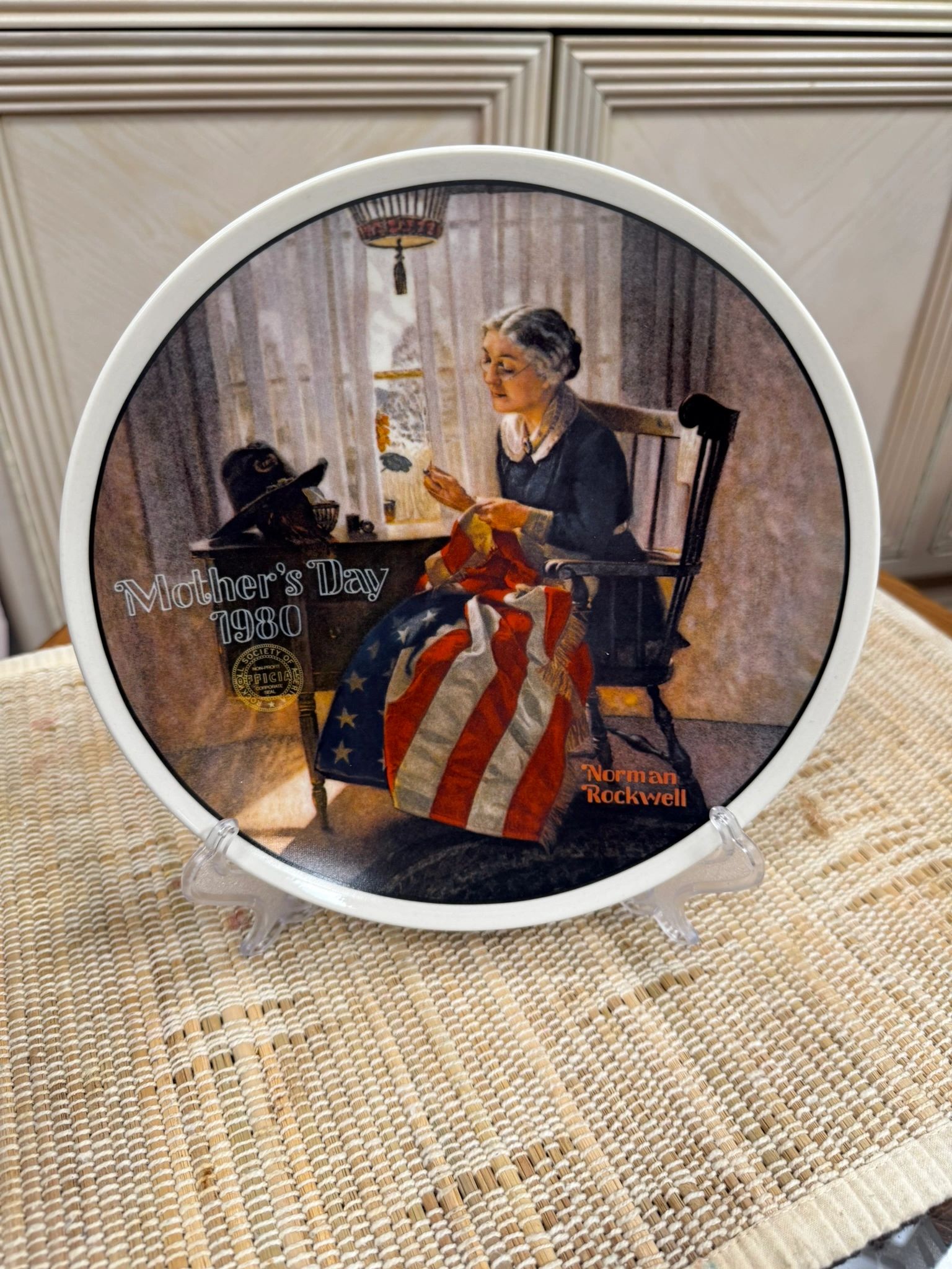 Celebrate Mother’s Day with this limited edition Edwin Knowles Norman Rockwell plate. Featuring a heartwarming illustration of a woman sewing an American flag. Perfect for any collector.