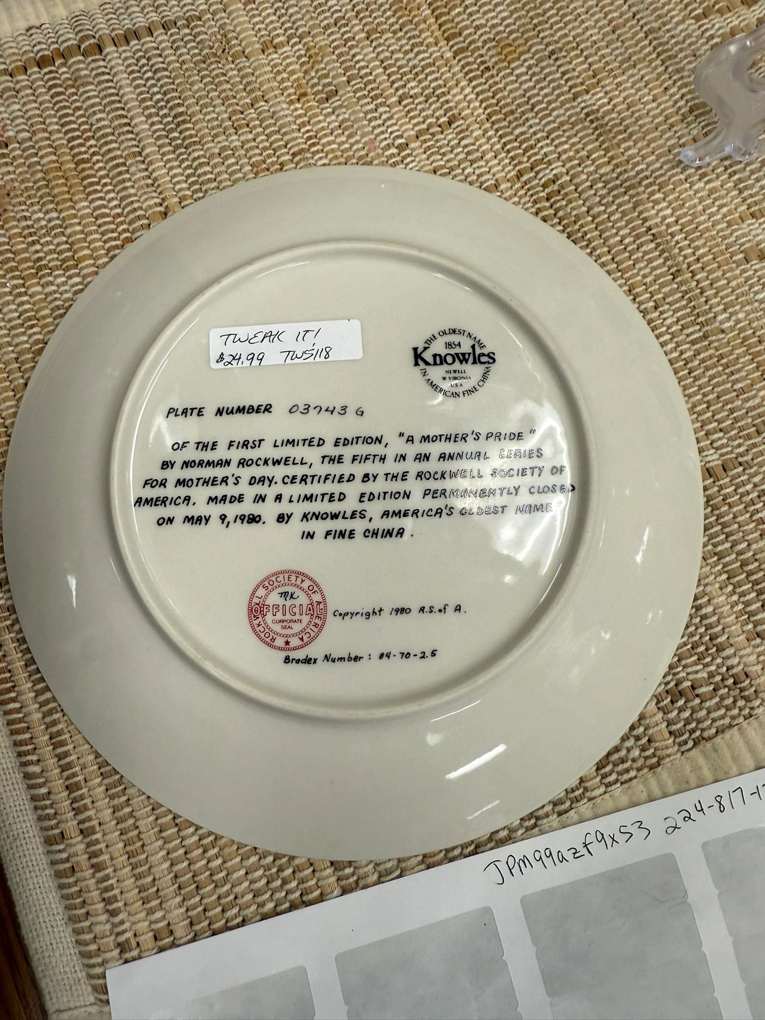 EDWIN KNOWLES – NORMAN ROCKWELL – MOTHER’S DAY 1980 PLATE #03743G