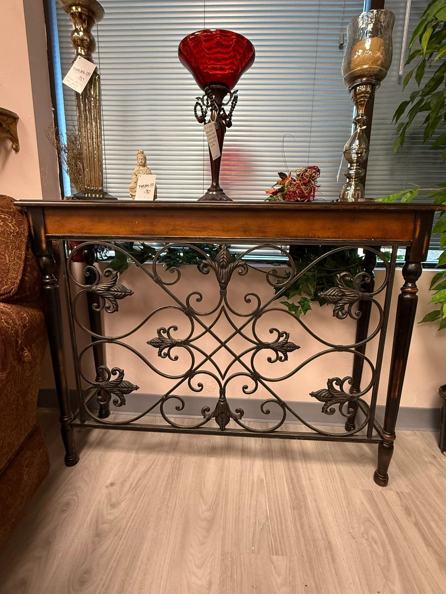 ENTRY WAY TABLE – BROWN WOOD AND WROUGHT IRON