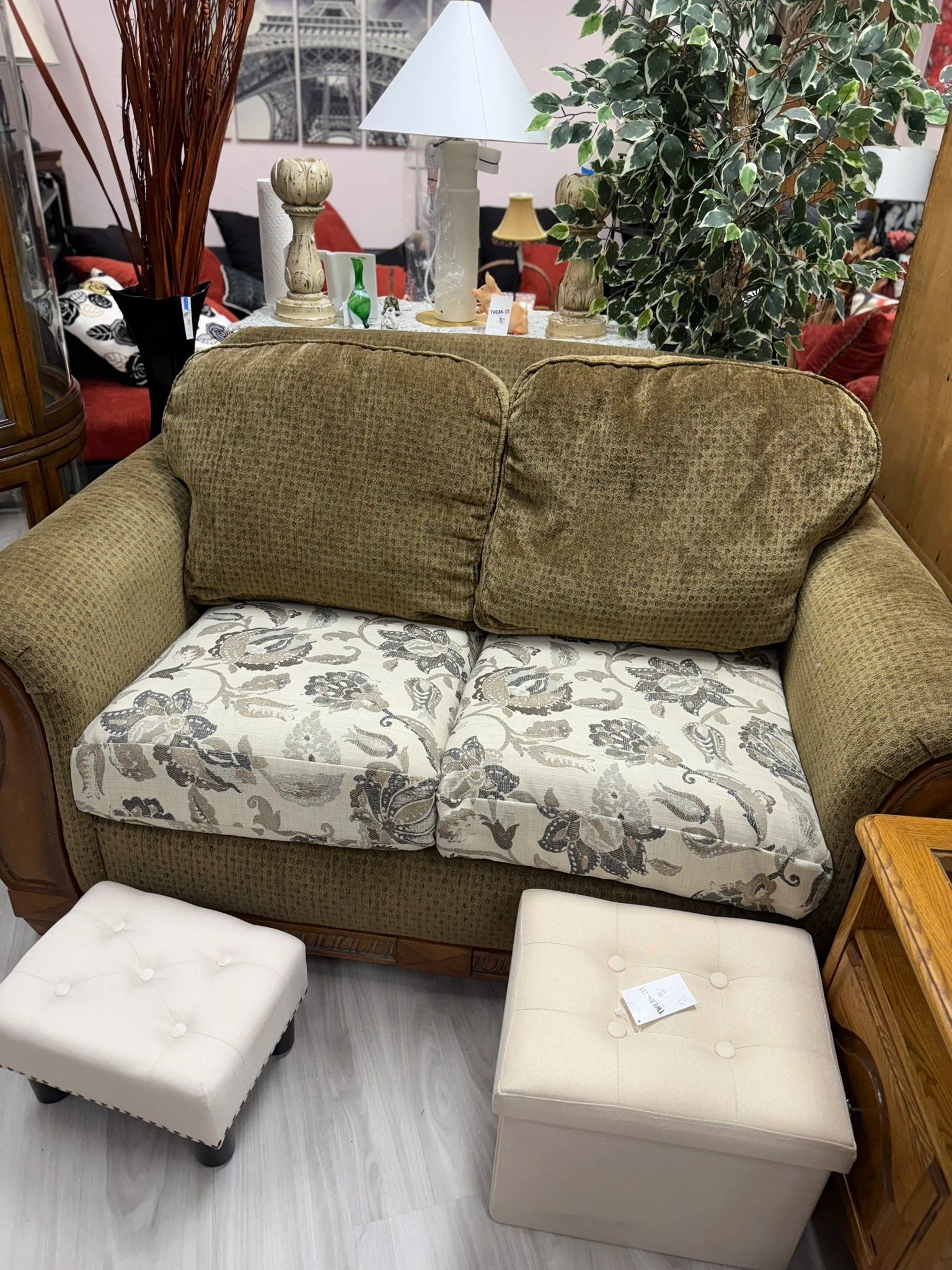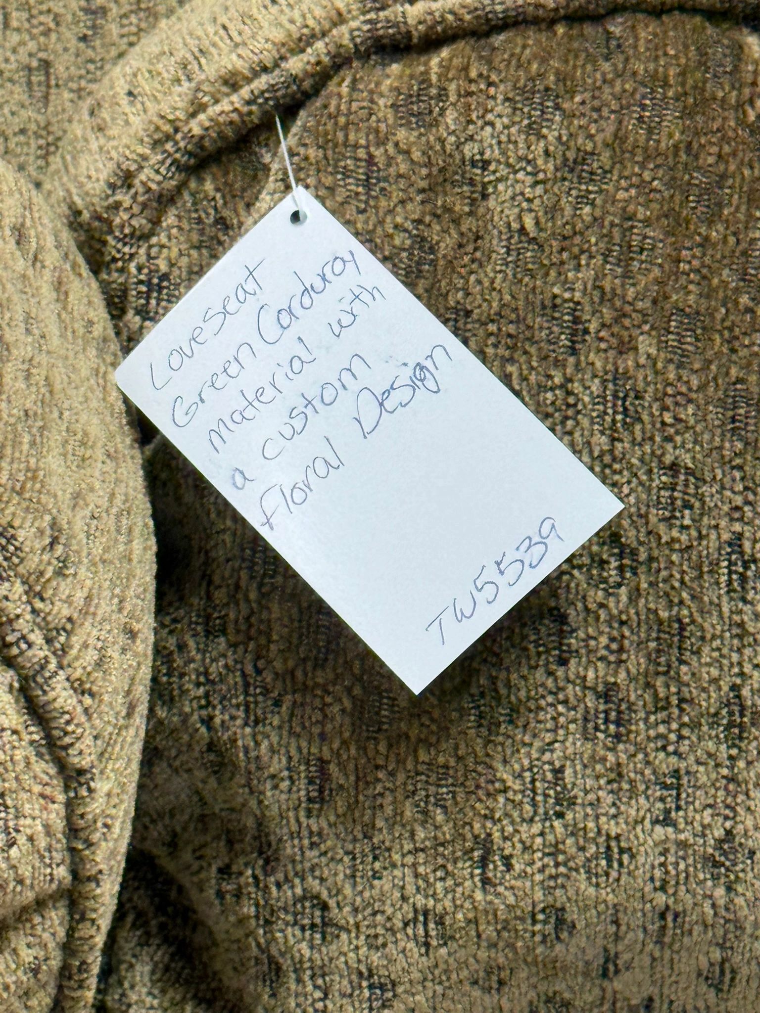 This loveseat couch is perfect for adding a touch of comfort and style to your home. Made with green corduroy material and custom floral cushions. Shipping not available.