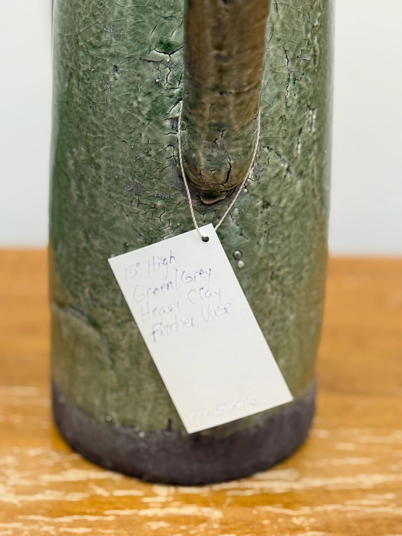 Elevate your home decor with our Heavy Clay Green/Grey Pitcher Vase. This tall ceramic piece boasts a rustic glaze and curved handle, perfect for showcasing your favorite blooms.