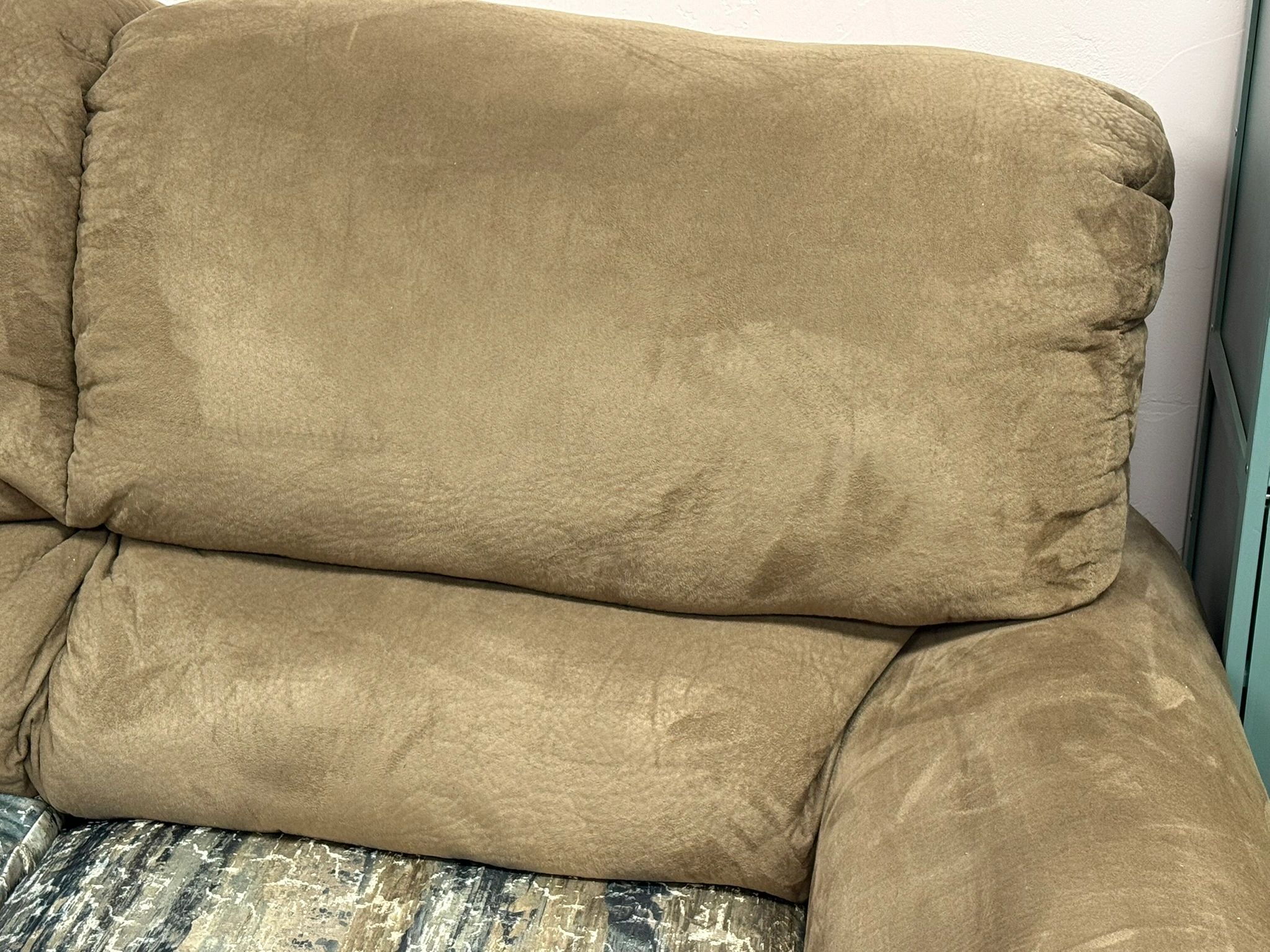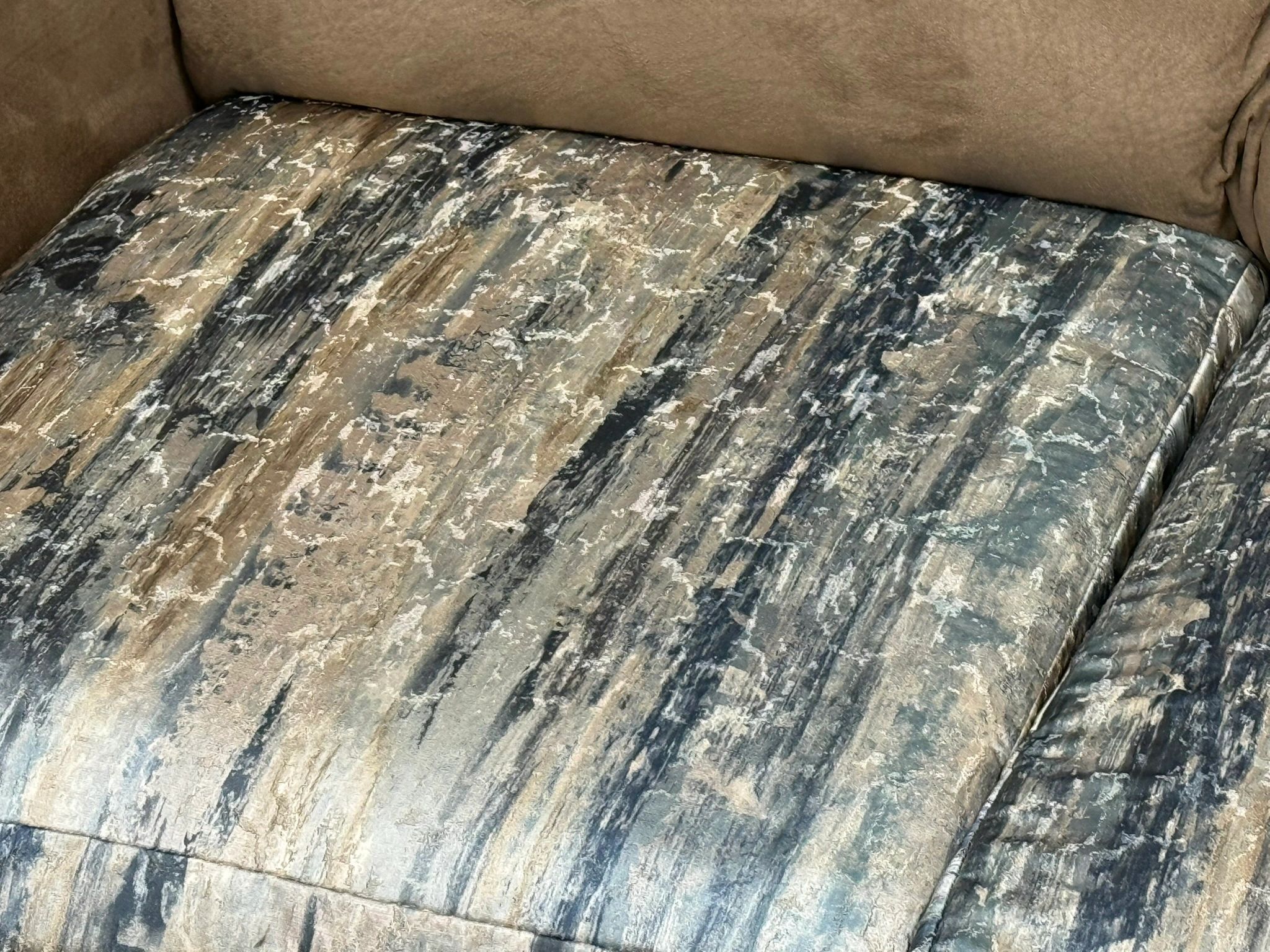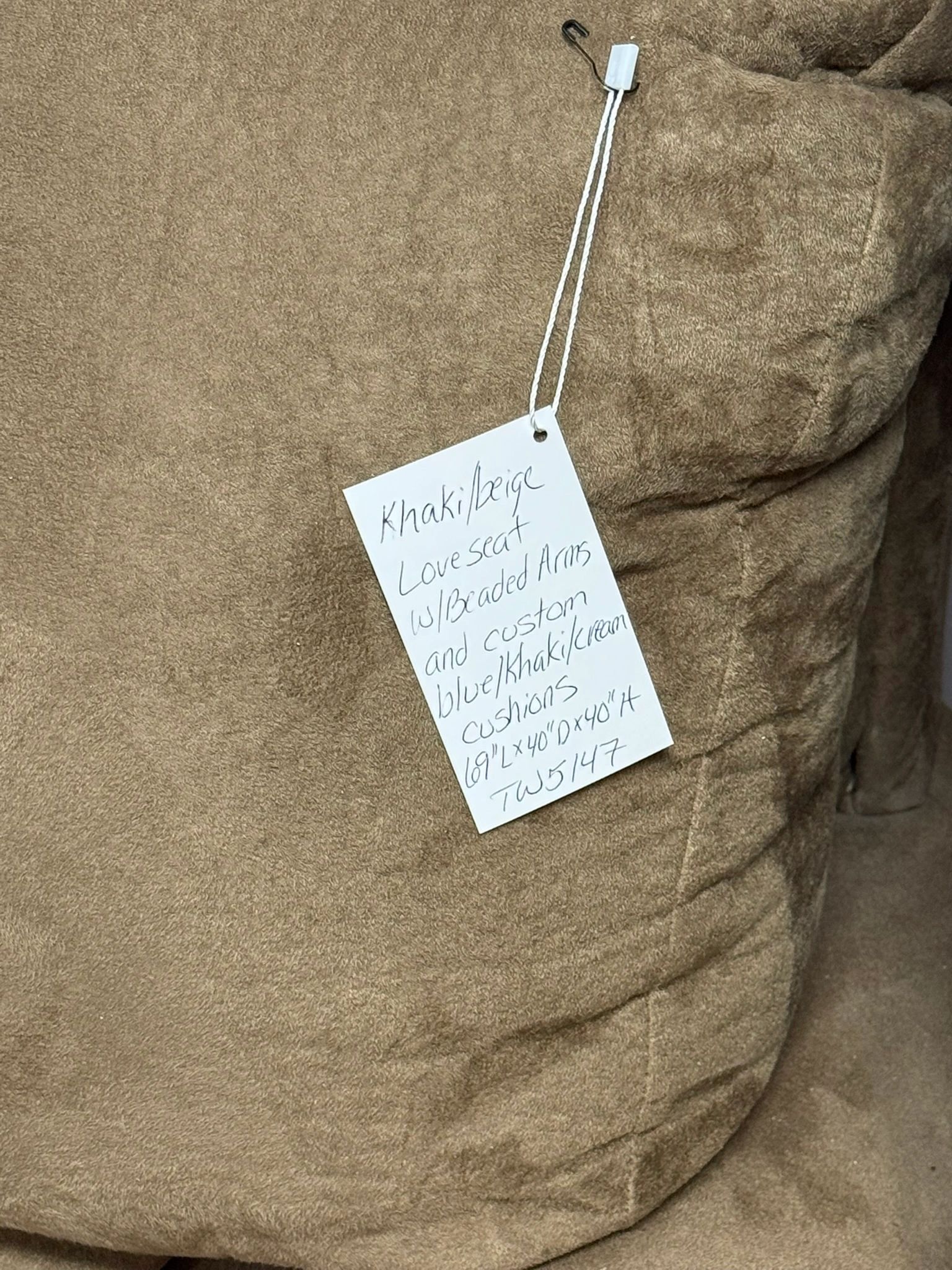 Transform your living room with our stylish khaki loveseat featuring a unique beaded front arm design and custom cream/blue/khaki seat cushions. Shipping not available. Cushions covers were customized locally – unique design