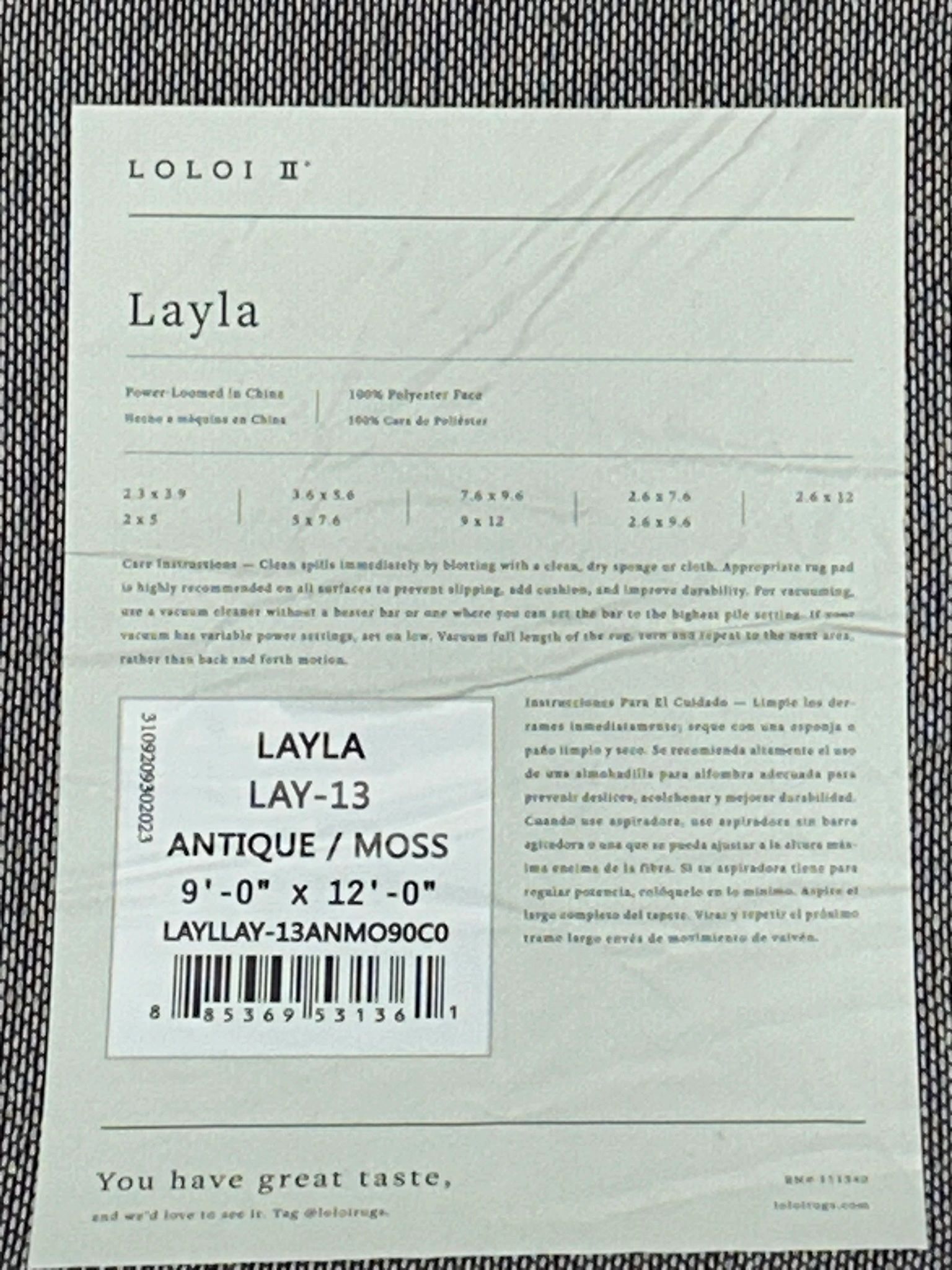 Loloi LAYLA Collection, LAY-13, Antique / Moss, 9′-0″ x 12′-0″, .13″ Thick