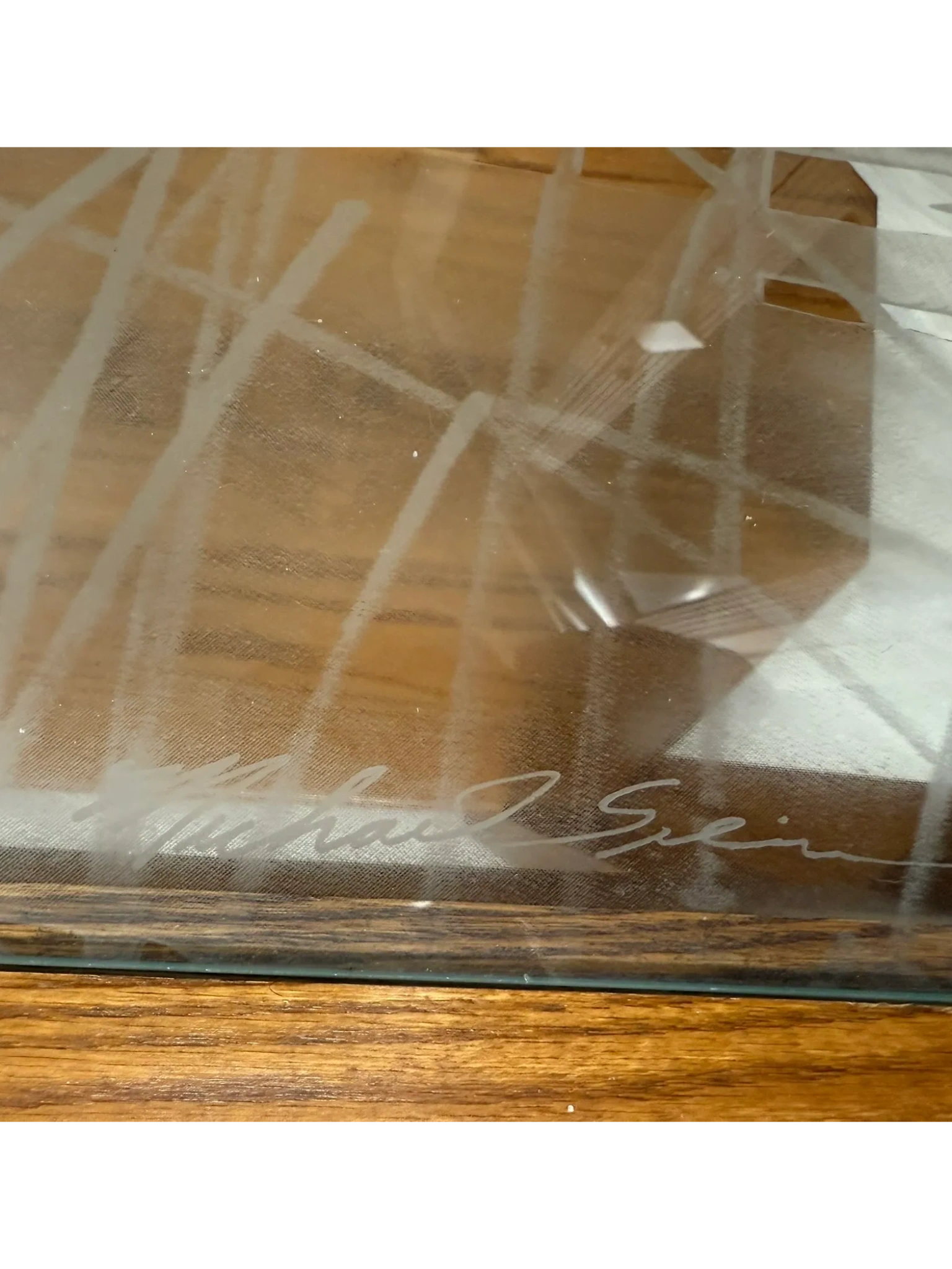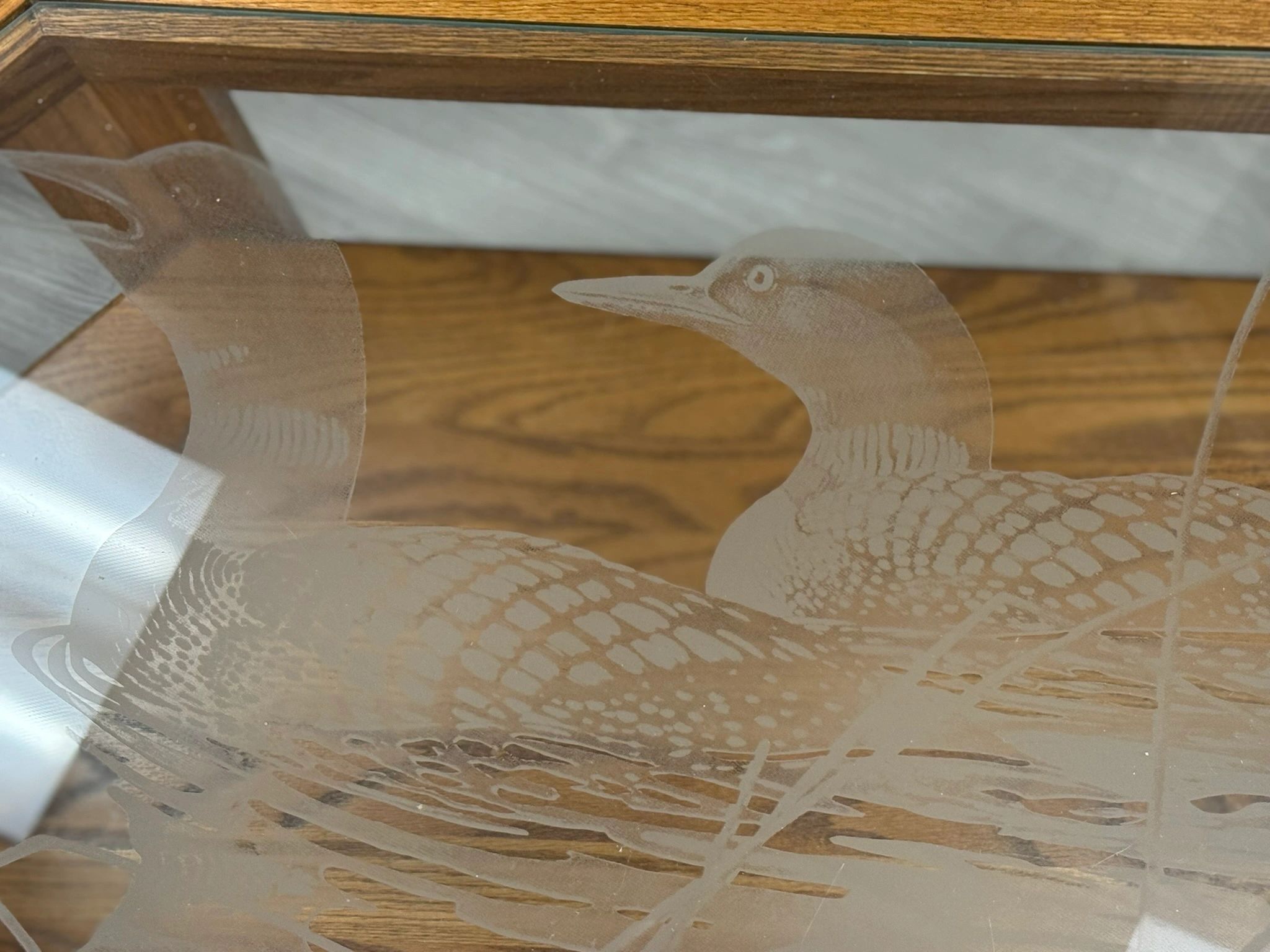 Oak Coffee Table with Loon etched glass top. (SHPPING NOT AVAILABLE)
