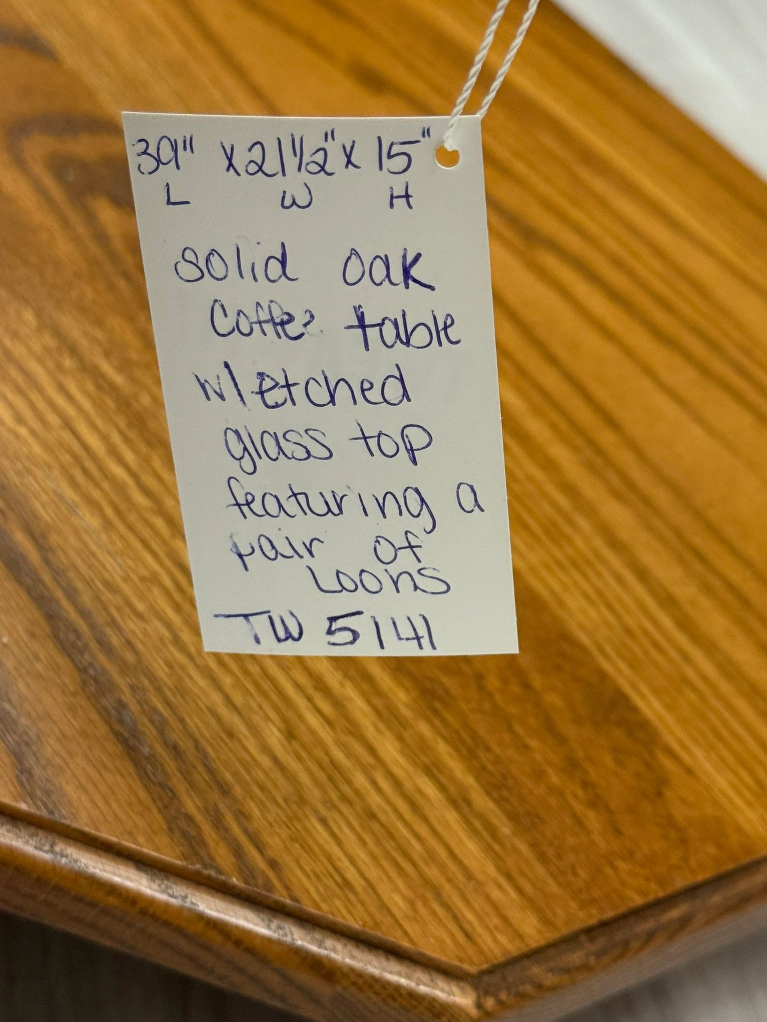 Oak Coffee Table with Loon etched glass top. 39” wide, 15” tall, 21.5” deep