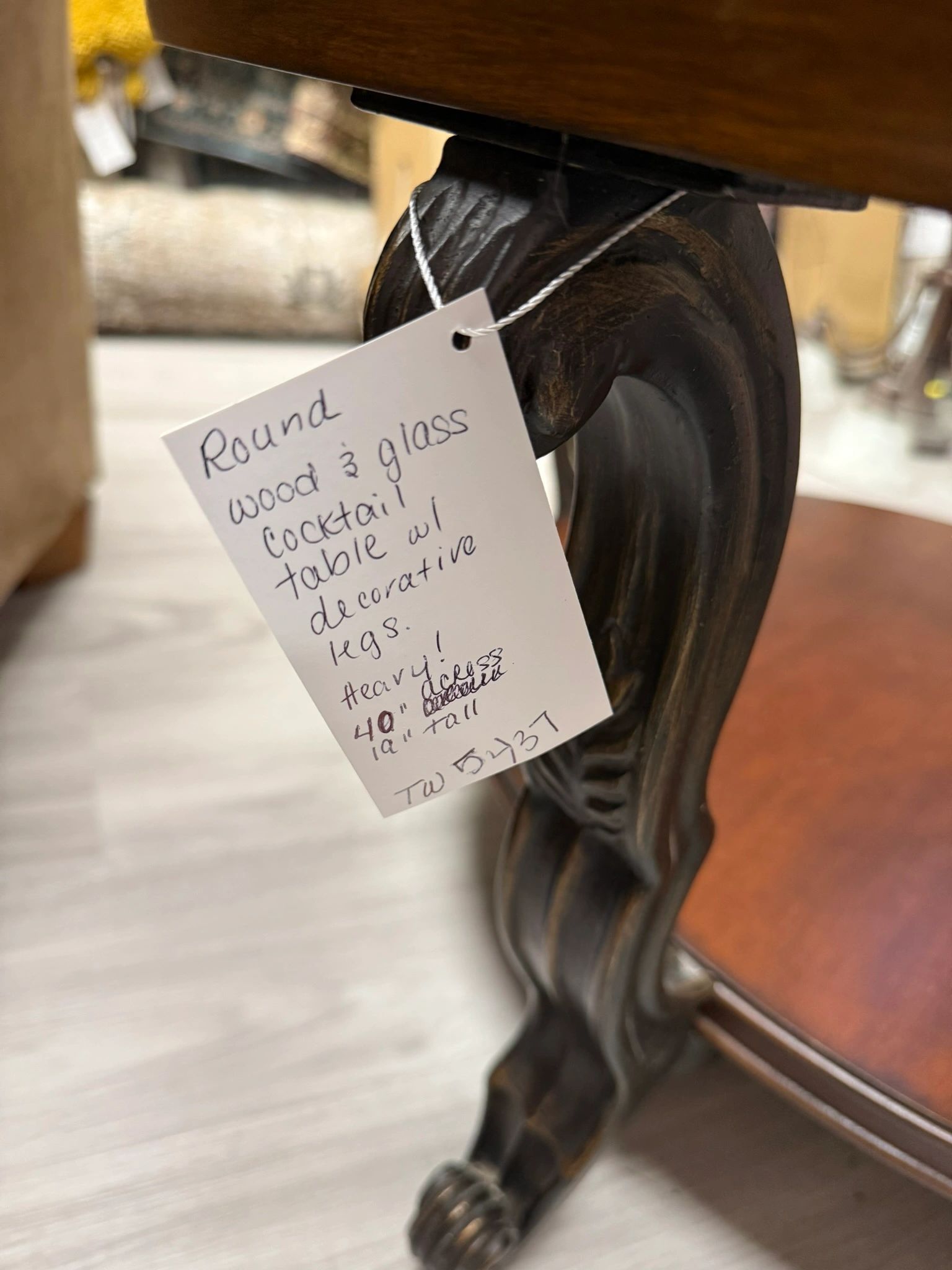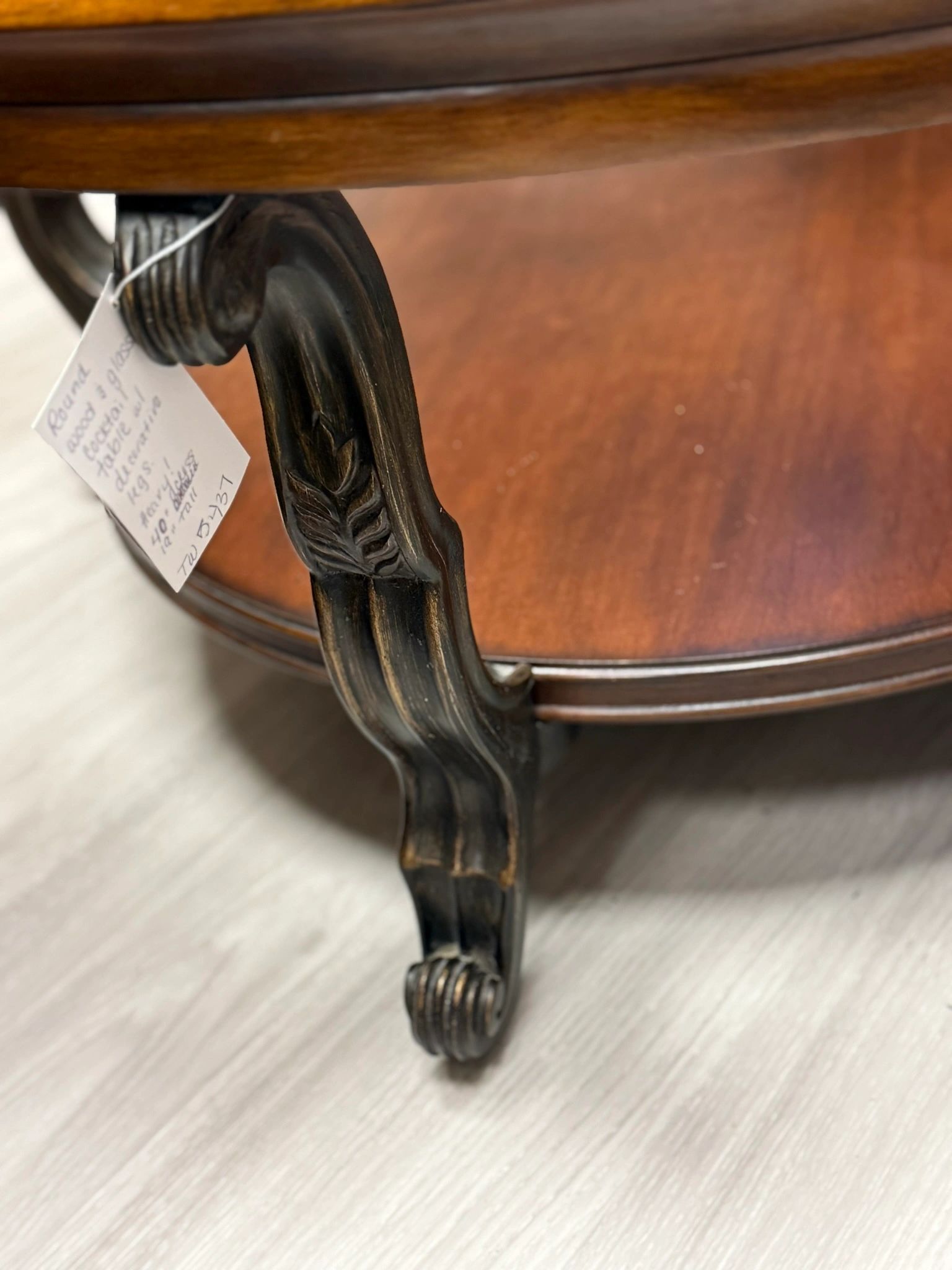 ROUND WOOD & GLASS COCKTAIL TABLE WITH DECORATIVE LEGS – HEAVY!