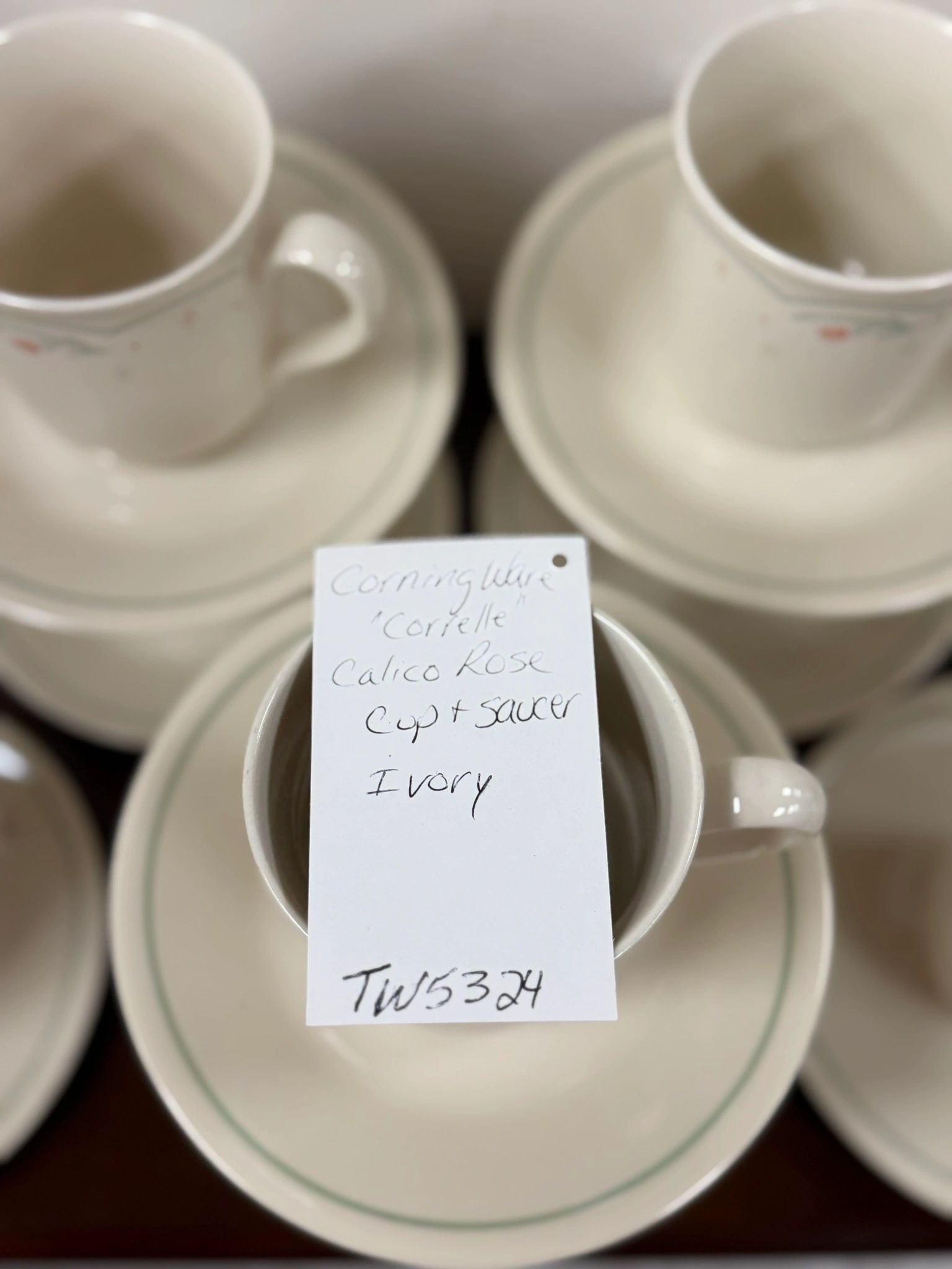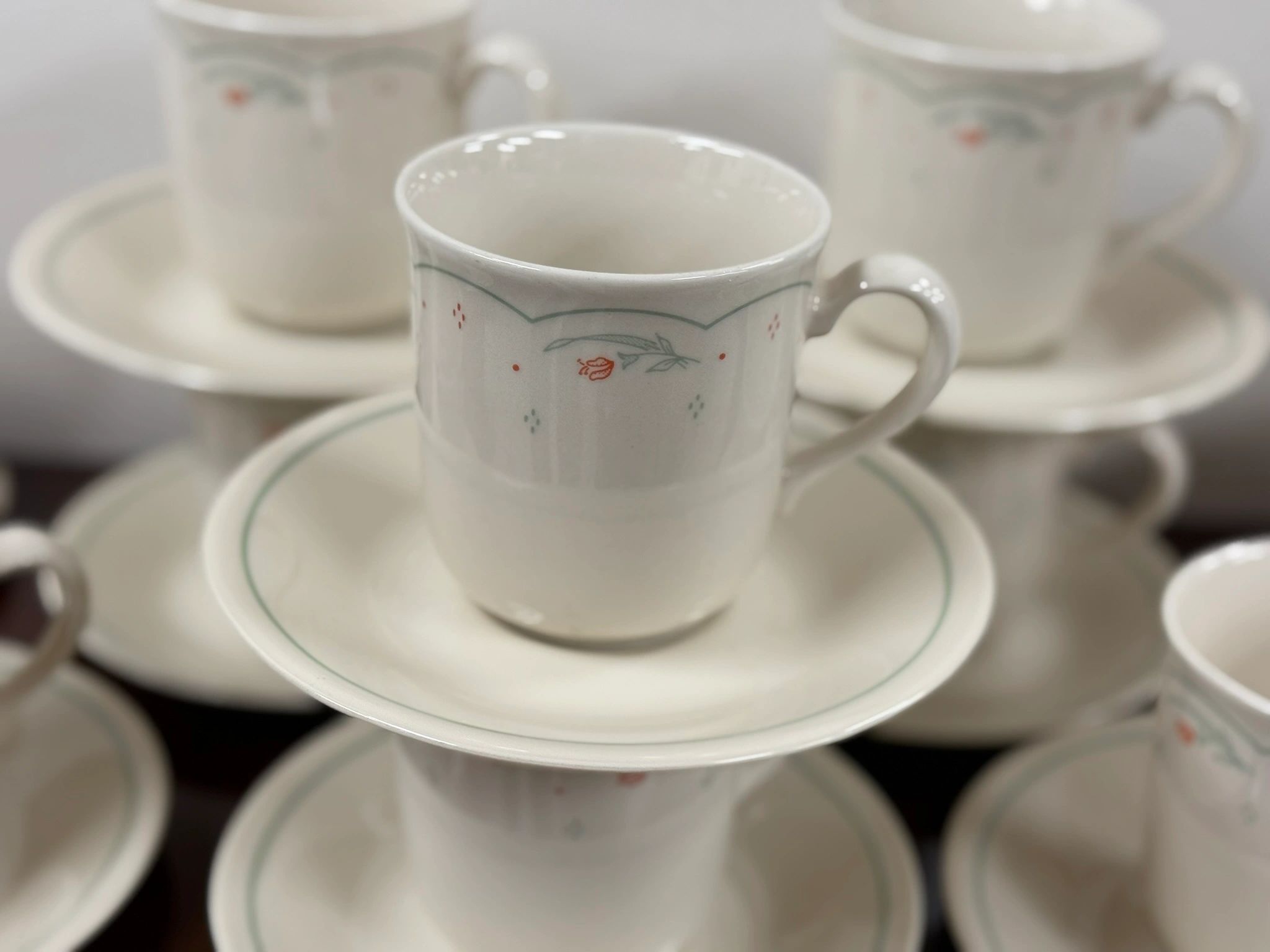 Enhance your tea time experience with this elegant set of 10 Corning Ware “Corelle” Calico Rose cup and saucer in ivory, including 2 extra saucers. Perfect for entertaining guests.