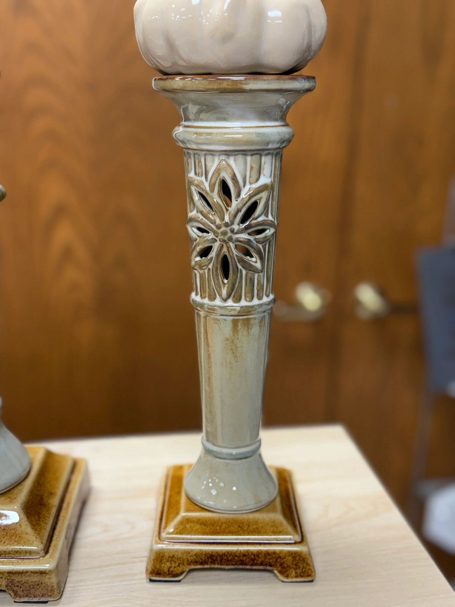 Enhance your fall decor with this charming set of 2 votives. One perfect for candles, the other adorned with a pumpkin design. Used but still beautiful.