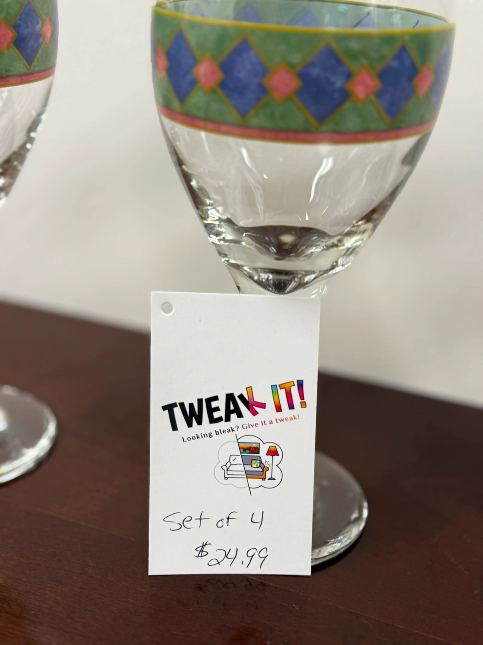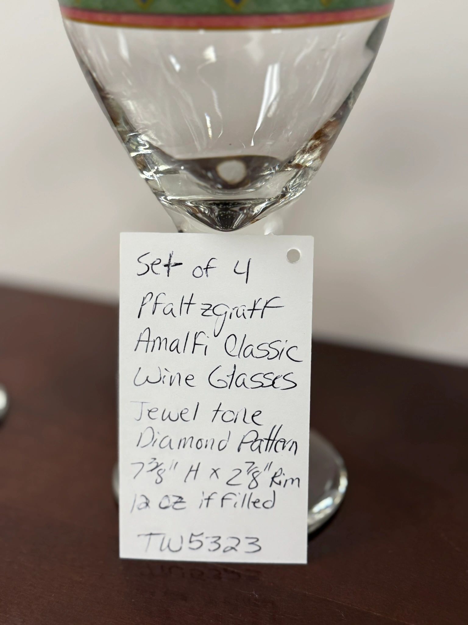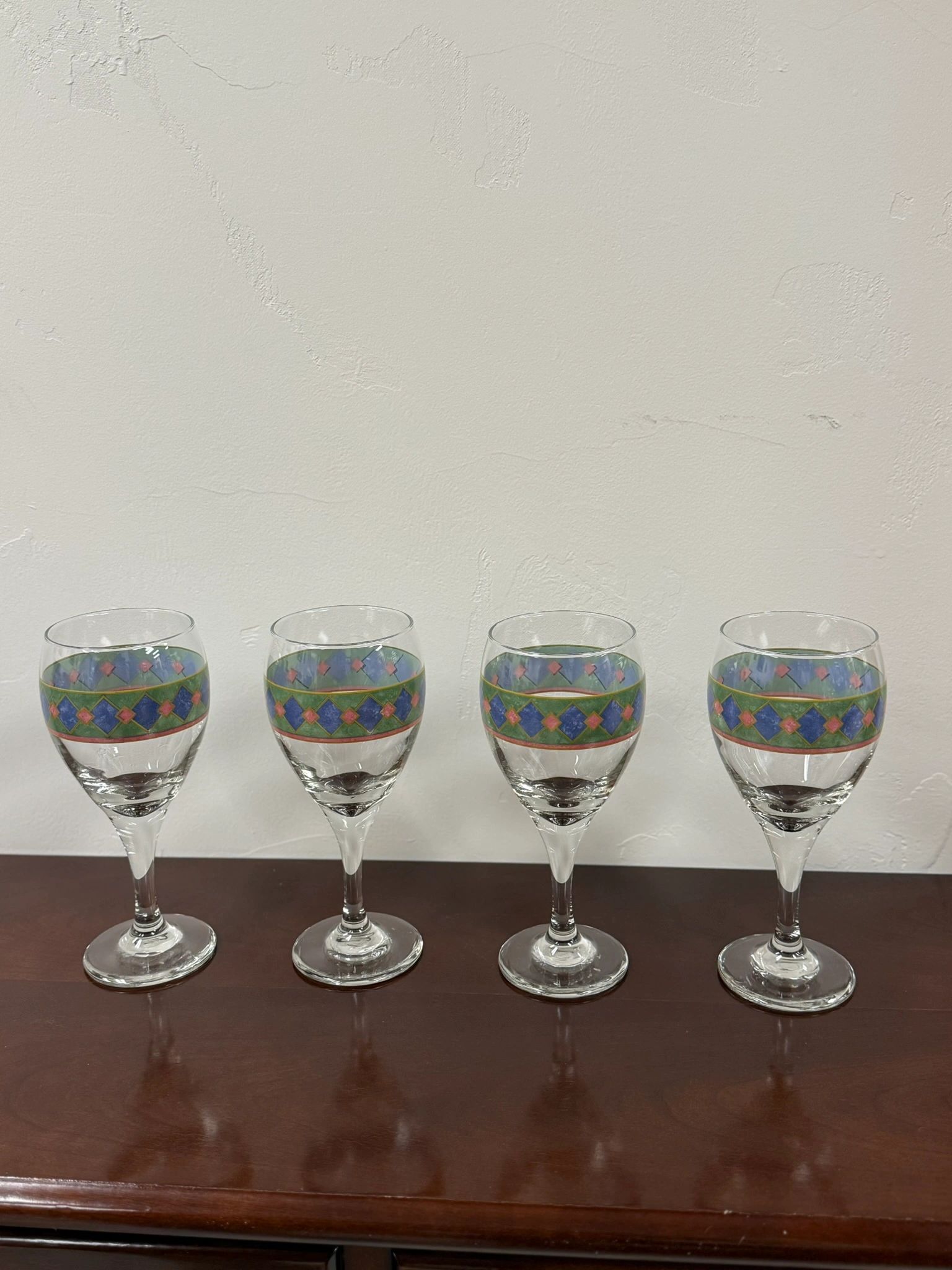 SET OF 4 PFALTZGRAFF AMALFI CLASSIC WINE GLASSES – JEWEL TONE DIAMOND PATTERN – 12 OZ IF FILLED TO RIM 7 1/8″ H X 2 7/8″ W AT RIM