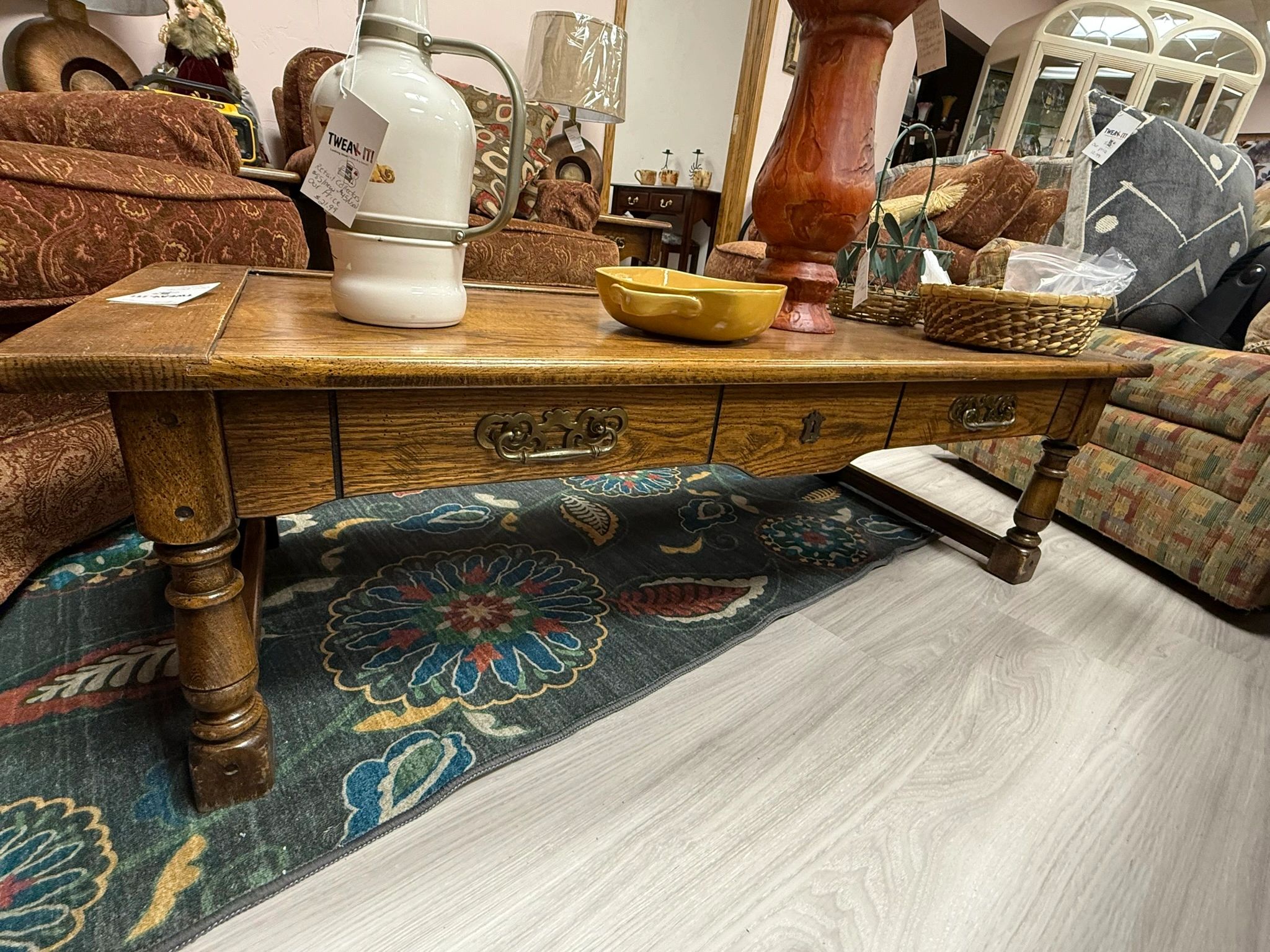 SOLID WOOD COFFEE TABLE AND 2 END TABLES – DARK WOOD WITH DECORATIVE HANDLES