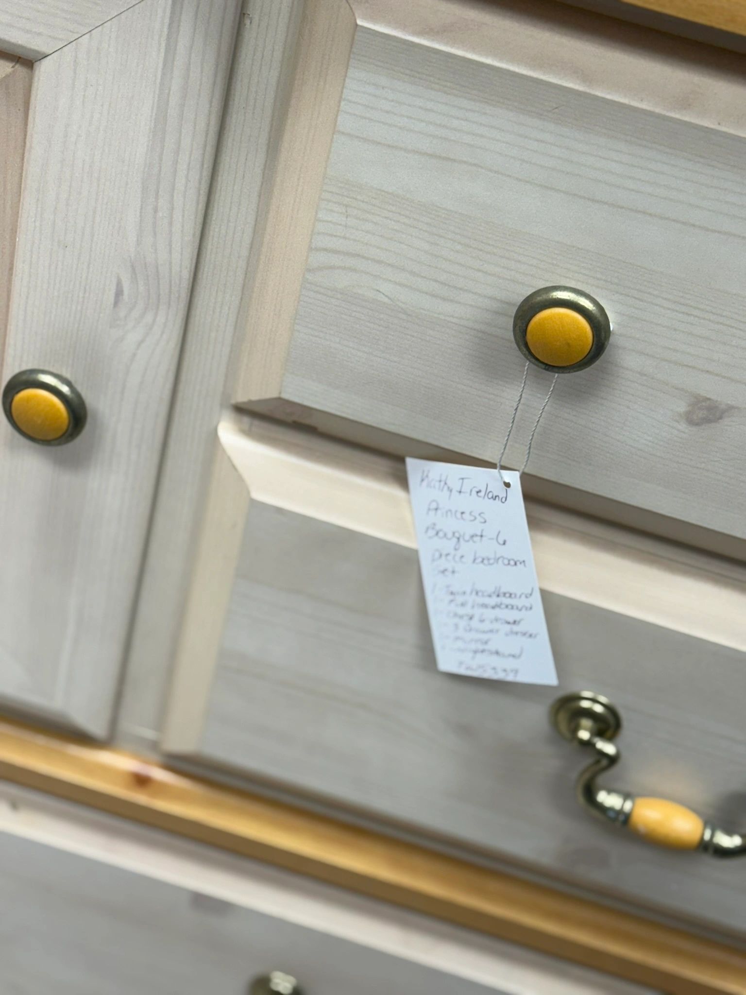 Transform your bedroom into a princess’s retreat with the Kathy Ireland Princess Bouquet 6 Piece Bedroom Set. Includes chest dresser, dresser, mirror, nightstand, twin headboard, and full headboard. Bedroom set is used, and last picture shows only blemish found.