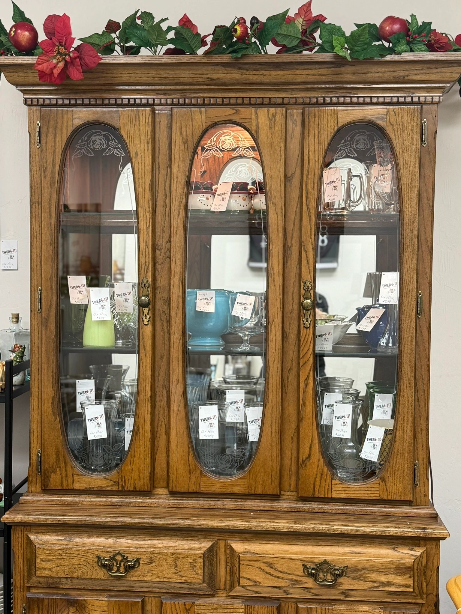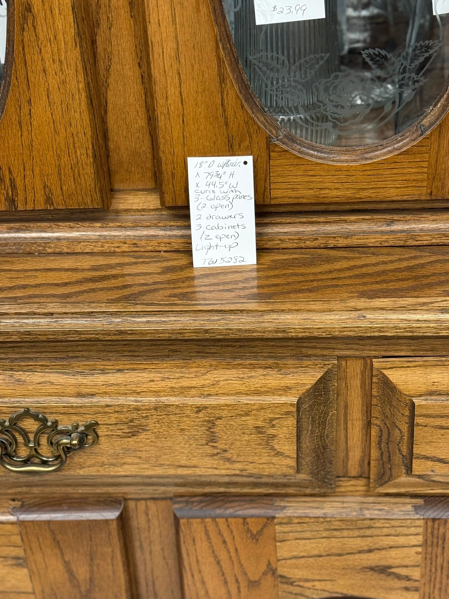 Enhance your home décor with this stunning oak wood light-up curio cabinet. Featuring 3 glass panes, 2 drawers, and lower cabinets, this beautiful piece is in excellent working condition.