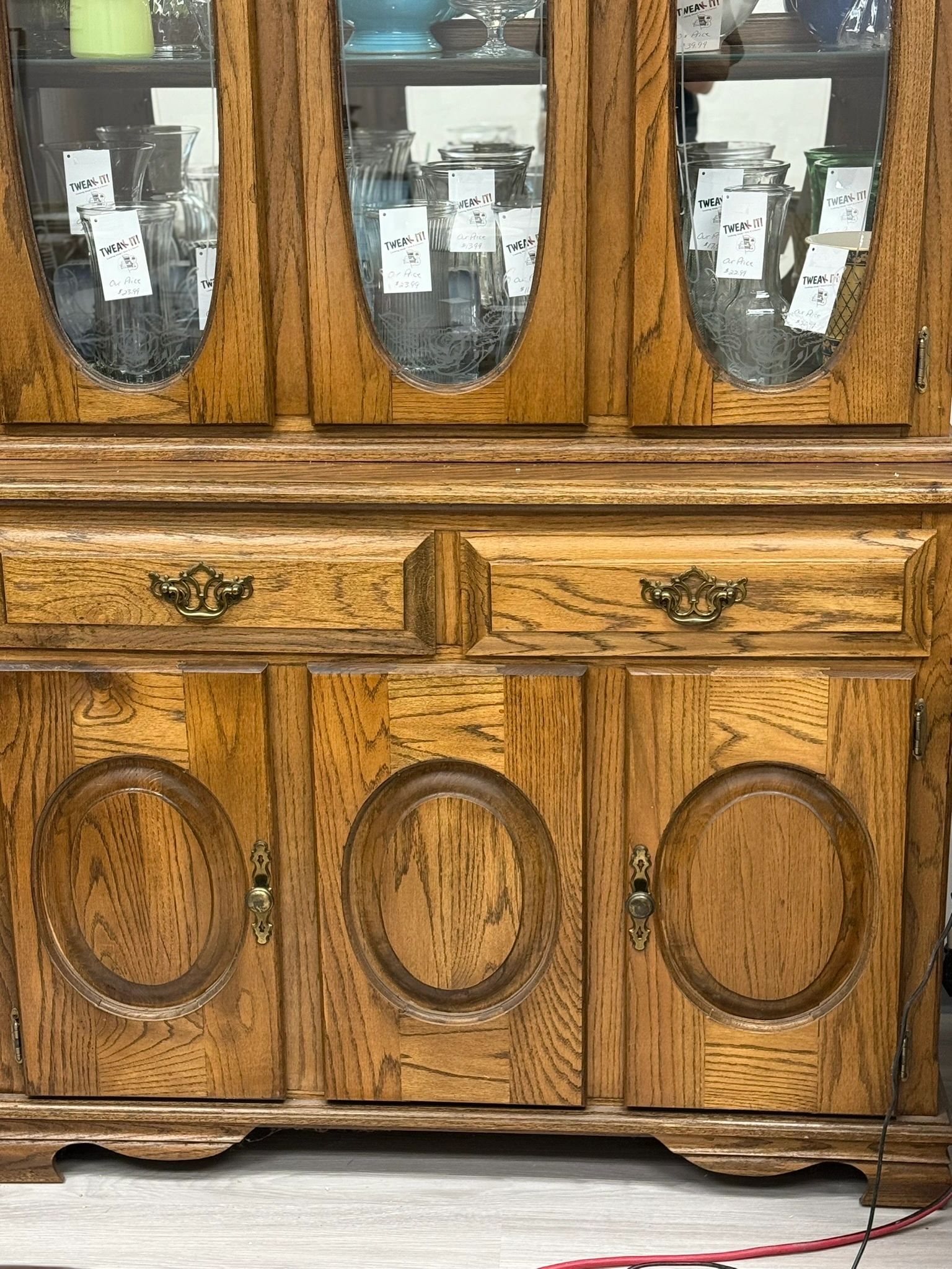 USED OAK WOOD LIGHT UP CURIO WITH 3 GLASS PANES (LEFT/RIGHT OPEN)/2 DRAWERS AND LOWER CABINETS (LEFT/RIGHT OPEN) – BEAUTIFUL PIECE WORKS AS IT SHOULD