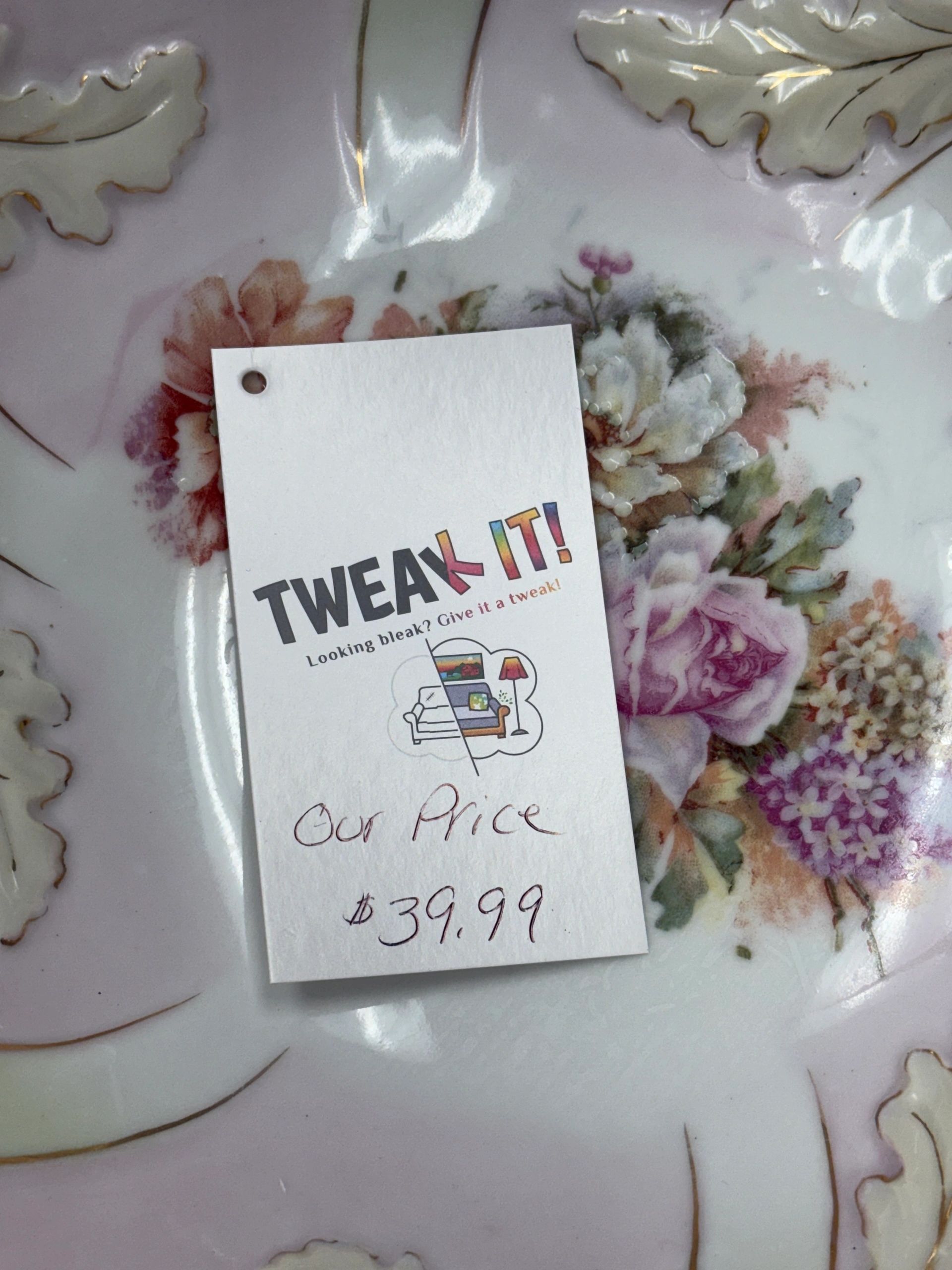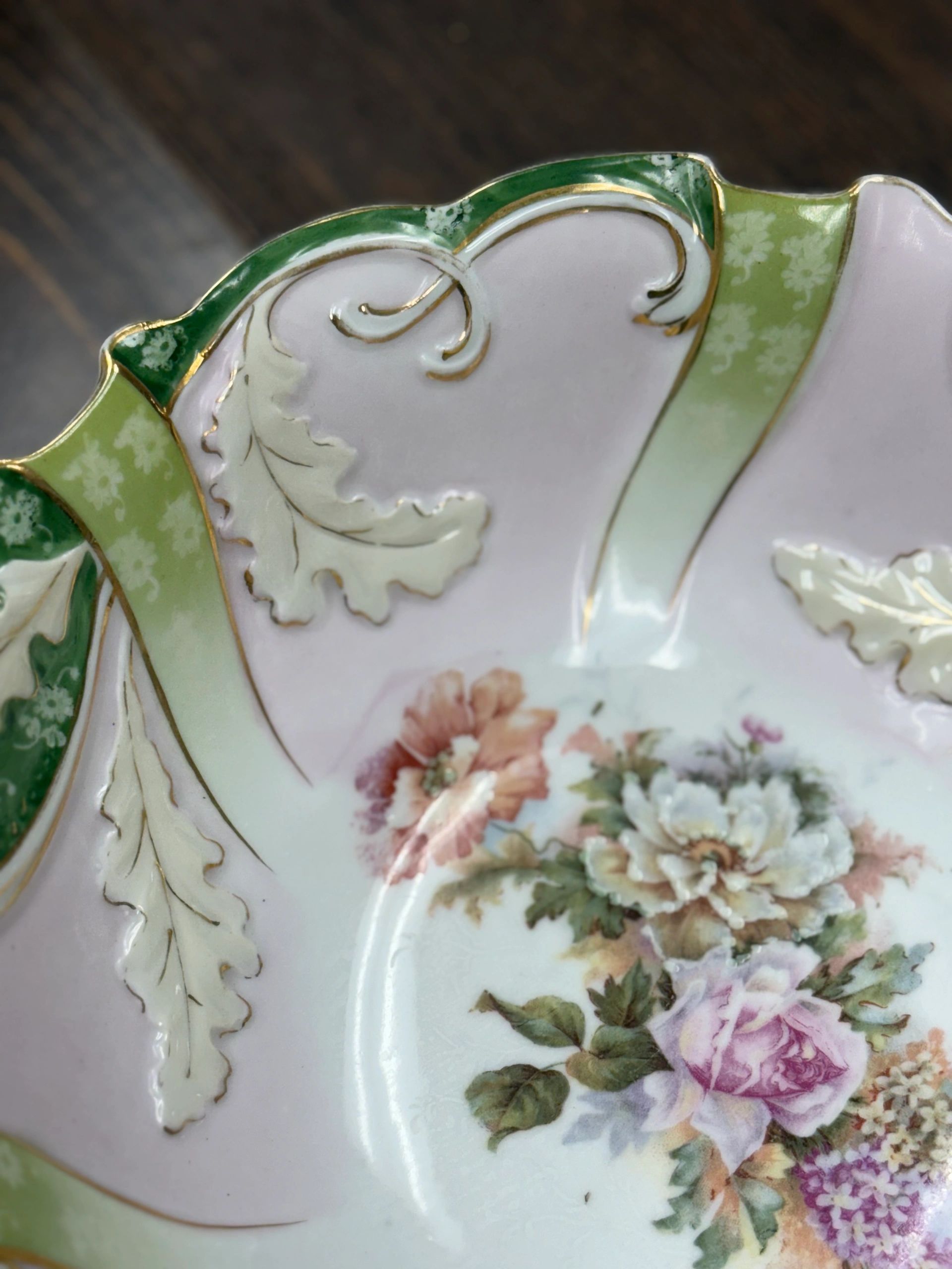 10″ ROUND ANTIQUE GERMAN PORCELAIN SERVING BOWL – FLOWERS HYDRANGAS/ROSES INLAID WITH GOLD TRIM