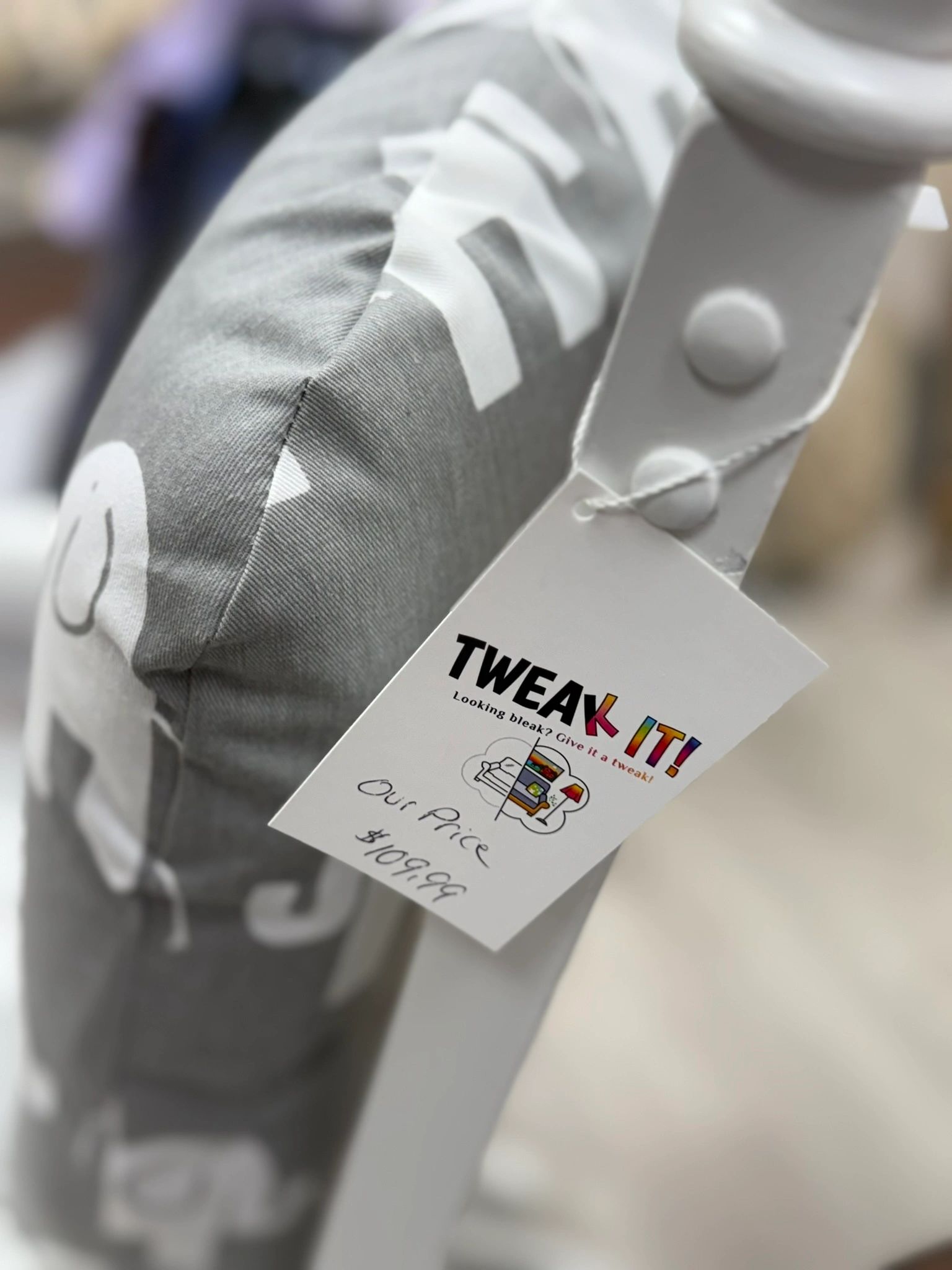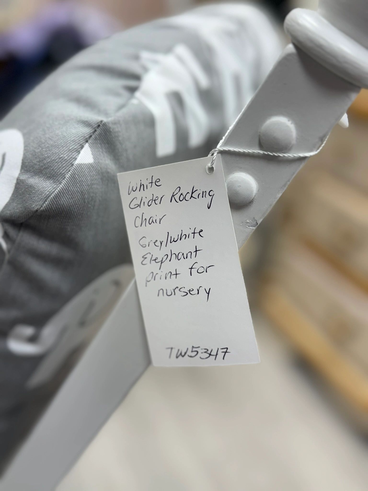 WHITE ROCKING/GLIDER CHAIR – GREY/WITH WHITE ELEPHANT CUSHIONS