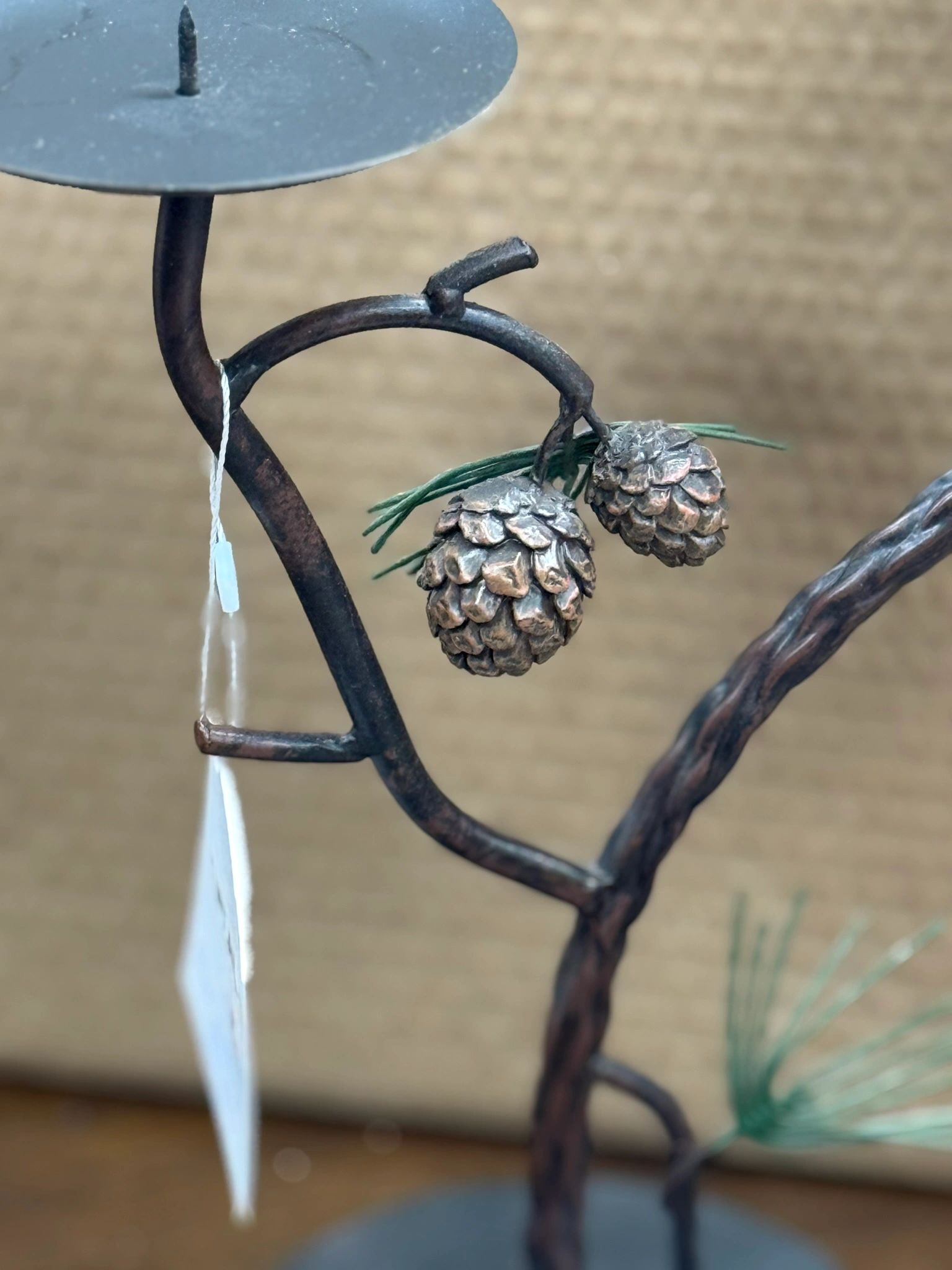 WROUGH IRON CANDLE HOLDER WITH PINE CONE DESIGN 12.5″ H