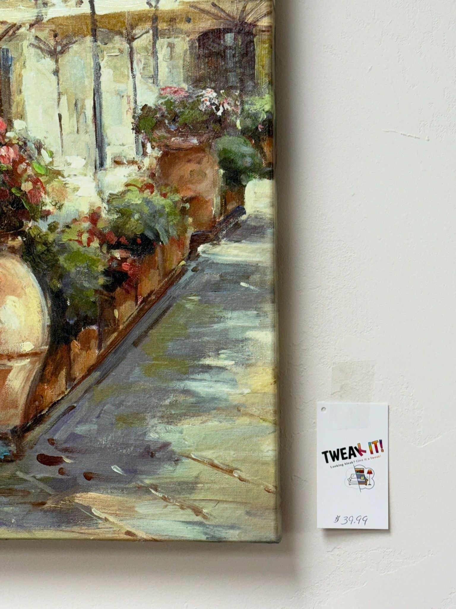 Enhance your home decor with this beautiful Café Canvas Painting. Featuring a charming outdoor scene with white umbrellas and colorful flowers, perfect for any personal space.