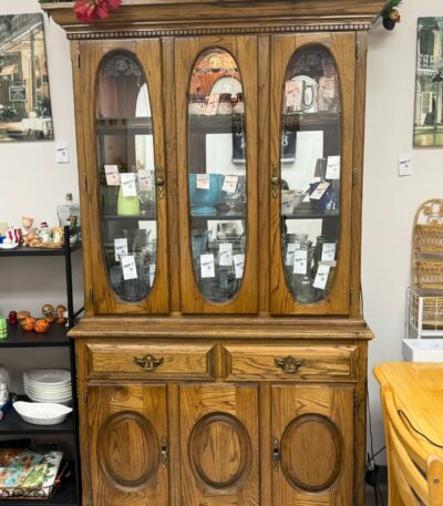 USED OAK WOOD LIGHT UP CURIO WITH 3 GLASS PANES (LEFT/RIGHT OPEN)/2 DRAWERS AND LOWER CABINETS (LEFT/RIGHT OPEN) – BEAUTIFUL PIECE WORKS AS IT SHOULD